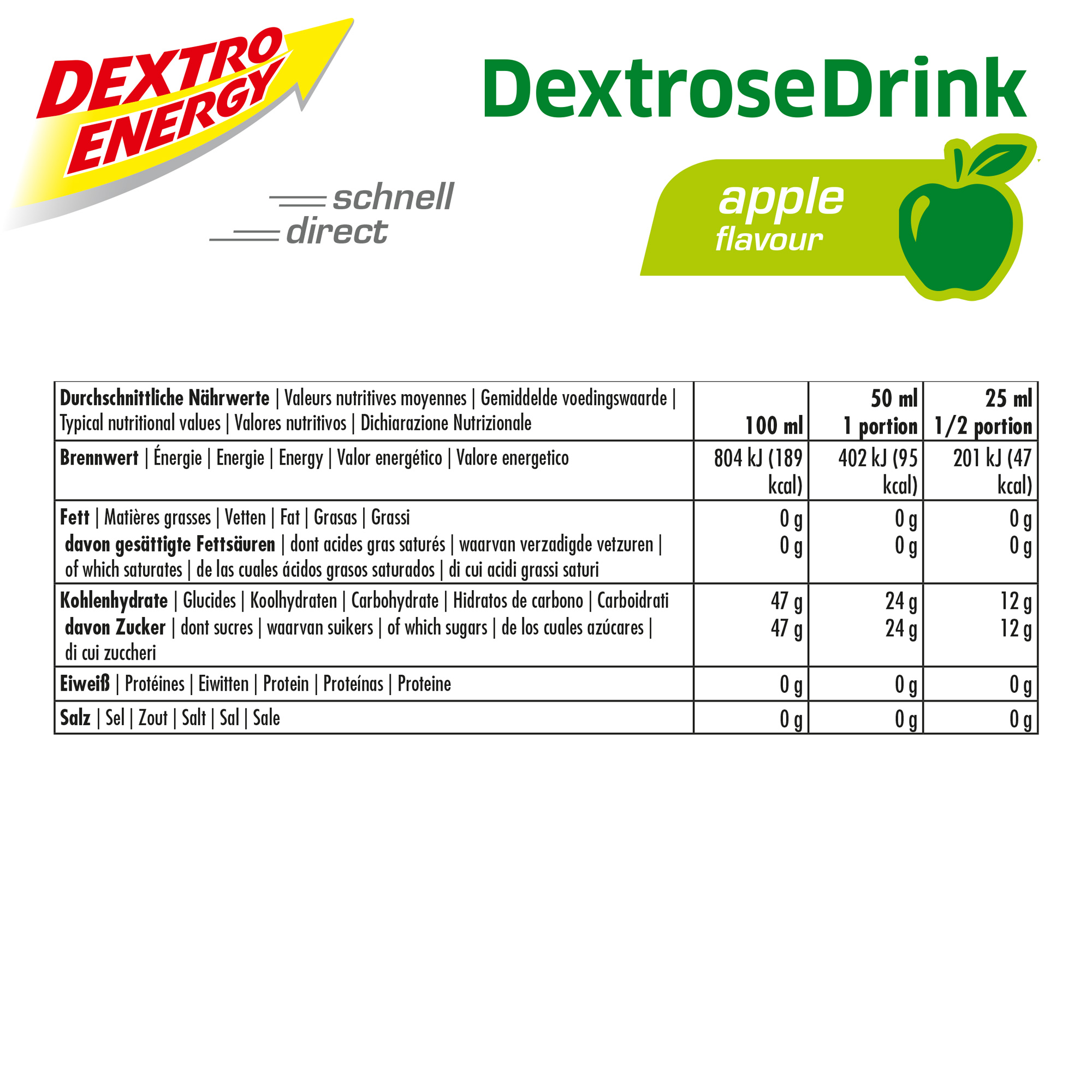 Für Diabetiker: Die flüssige Alternative zu den bekannten Dextrosetäfelchen – 50ml enthalten 18g schnell verfügbare Glukose und stellen insgesamt 24g Kohlenhydrate bereit. Ideal in Situationen der Unterzuckerung. Trinkfertig liefert der Dextrose Drink schnell verfügbare Kohlenhydrate. Mit fruchtigem Apfelgeschmack.