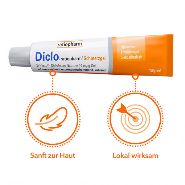 In Diclo-ratiopharm® Schmerzgel ist der Wirkstoff Diclofenac enthalten. Dieser lindert Schmerzen und Entzündungen direkt im betroffenen Gewebe. Das Schmerzgel zieht schnell ein und wirkt zusätzlich kühlend. Diclo-ratiopharm® Schmerzgel enthält Liposomen und ist frei von Parfüm und somit auch für Menschen mit einer empfindlichen Haut oder einer Duftstoffallergie geeignet.