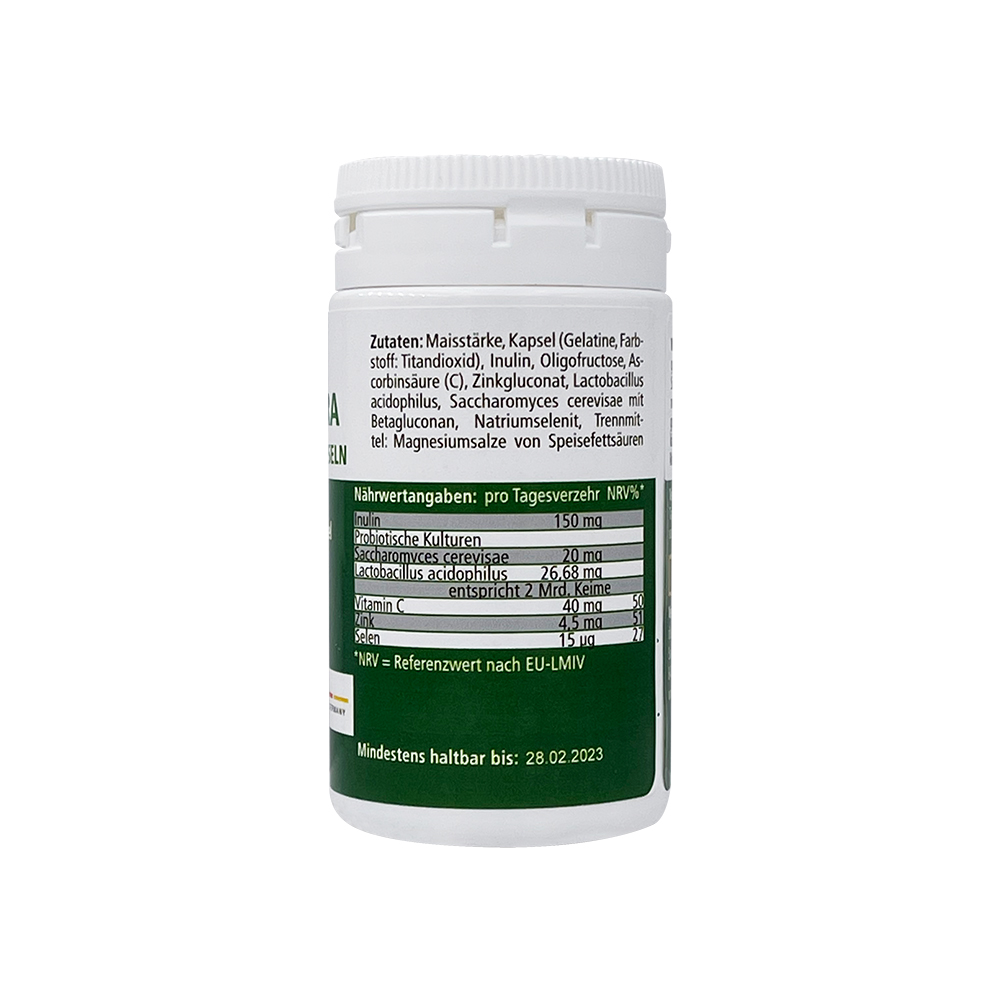 Maisstärke, Kapsel (Gelatine, Farbstoff: Titandioxid), Inulin, Oligofructose, Ascorbinsäure (C), Zinkgluconat, Lactobacillus acidophilus, Saccharomyces cerevisae mit Betagluconan, Natriumselenat, Trennmittel: Magnesiumsalze von Speisefettsäuren