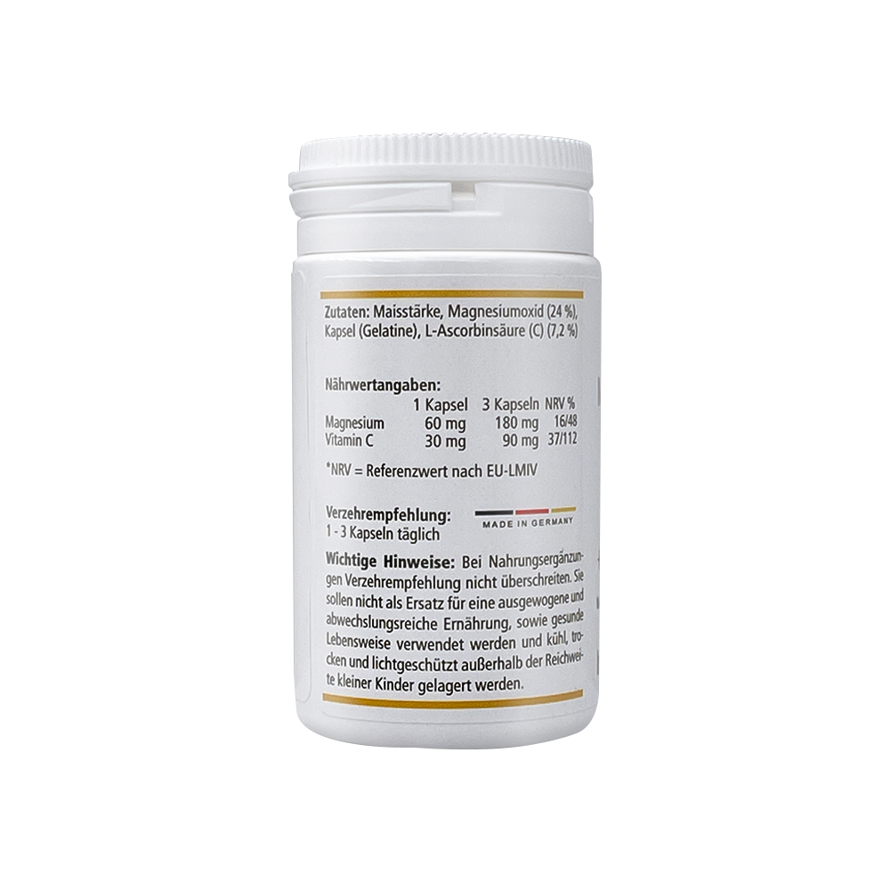 Zusammensetzung/Kapsel: Maisstärke, Magnesiumoxid (24 %), Kapsel (Gelatine), L-Ascorbinsäure (C) (7,2 %)