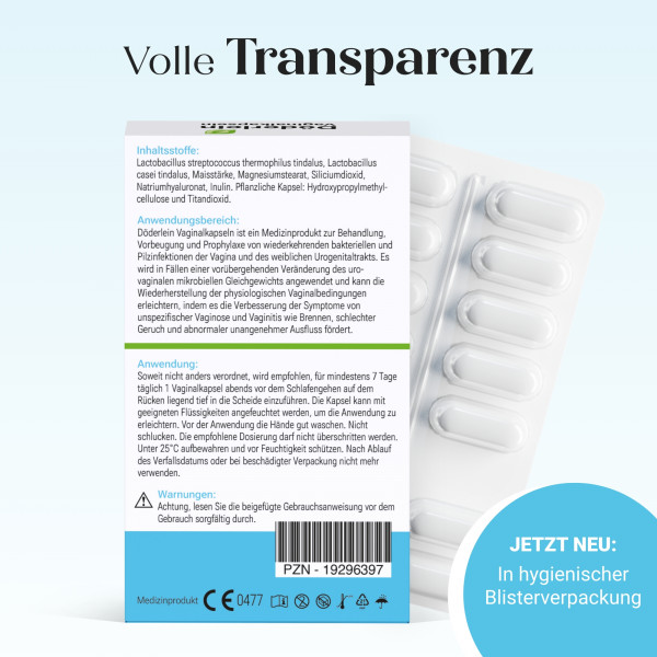 DÖDERLEIN® Vaginalkapseln mit Milchsäurebakterien und Hyaluronsäure - zur Pflege der Vaginalschleimhaut.