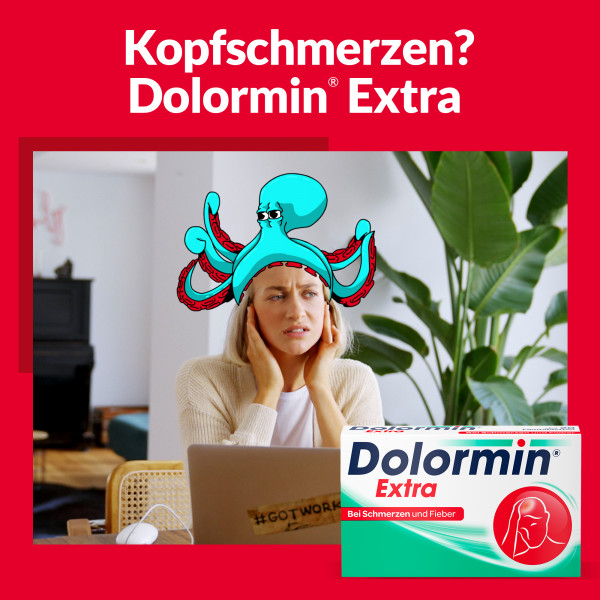 Pressend, ziehend, drückend – Viele Menschen kennen diese Kopfschmerzsymptome nur zu gut. Kopfschmerzen zählen zu den häufigsten Gesundheitsproblemen und können unseren Alltag stark beeinträchtigen. Manchmal helfen schon frische Luft, ein Glas Wasser oder Ruhe, um die Kopfschmerzen zu lindern. Für den Fall, dass der Schmerz trotzdem bleibt, gibt es Dolormin® Extra. Die schmerzlindernde Wirkung setzt meist schon nach 15 Minuten ein und hält bis zu 8 Stunden an. So lindert Dolormin® Extra schnell und langanhaltend leichte bis mäßig starke Schmerzen und Fieber.