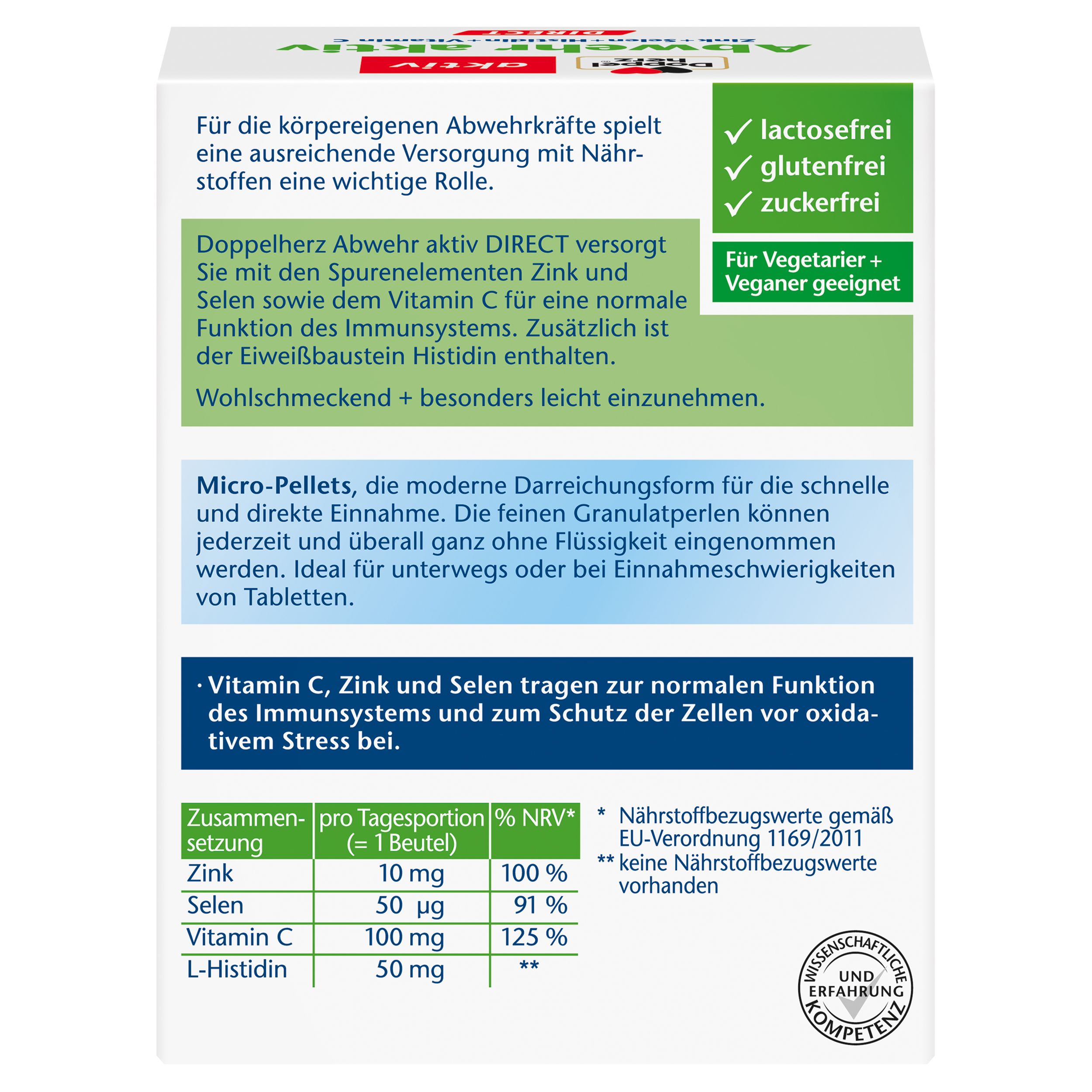 Nicht nur in der nasskalten Jahreszeit gilt es, die Abwehrkräfte zu unterstützen! Eine ausgewogene Ernährung und insbesondere die Versorgung mit speziellen Vitaminen und Spurenelementen spielt hier eine bedeutende Rolle. Doppelherz Abwehr aktiv DIRECT enthält 10 mg Zink, 50 µg Selen und 100 mg Vitamin C sowie 50 mg des Eiweißbausteins Histidin und schmeckt außerdem ausgezeichnet nach Orange! Die Spurenelemente Zink und Selen sowie Vitamin C tragen zur normalen Funktion des Immunsystems und außerdem zum Schutz der Zellen vor oxidativem Stress bei. Zudem ist Zink auch an der Zellteilung beteiligt. Selen unterstützt zusätzlich die normale Schilddrüsenfunktion. Die lebenswichtigen Spurenelemente Zink und Selen kann der Körper nicht selbst bilden. Daher sollten sie regelmäßig und ausreichend über die Nahrung aufgenommen werden.