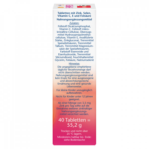• Vitamin E und Selen leisten einen Beitrag zum Schutz der Zellen vor oxidativem Stress / Folsäure und Selen unterstützen den gesunden Zellstoffwechsel