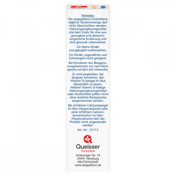DoppelherzNahrungsergänzungsmittel sind kein Ersatz für eine ausgewogene und abwechslungsreiche Ernährung und eine gesunde Lebensweise. Die angegebene empfohlene tägliche Verzehrsmenge darf nicht überschritten werden. Außerhalb der Reichweite von kleinen Kindern aufbewahren.