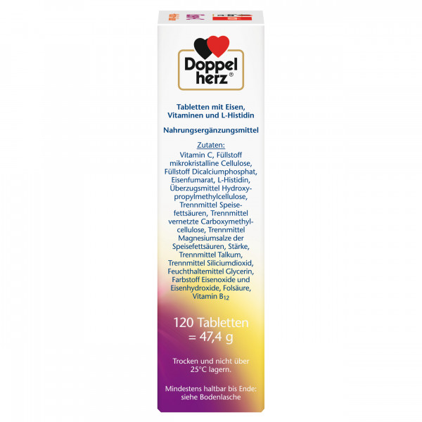 Neben 14 mg Eisen enthalten die gut schluckbaren Mini-Tabletten von Doppelherz Vitamin C, die Aminosäure Histidin, sowie die B-Vitamine Folsäure und B12.