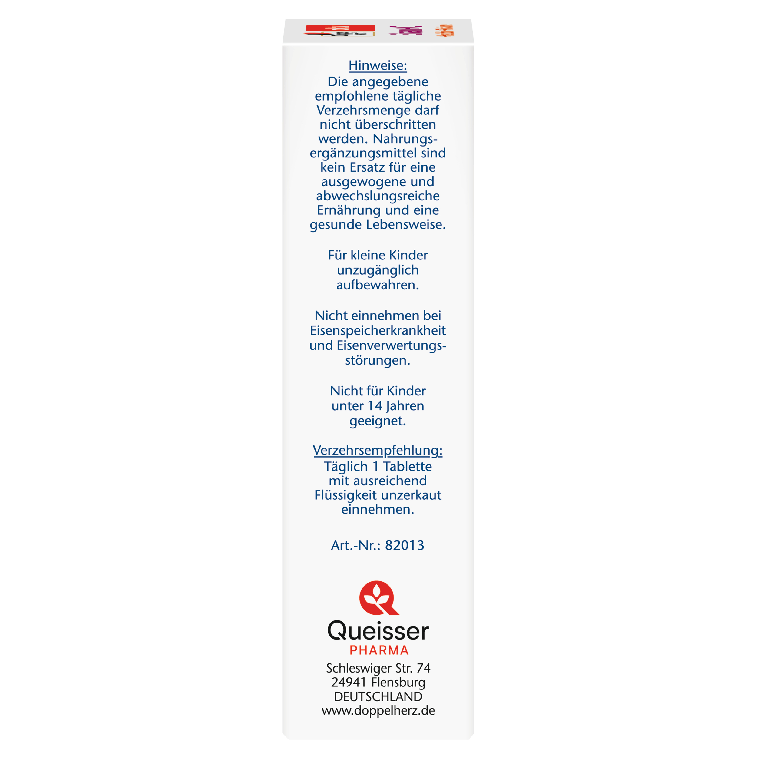 DoppelherzNahrungsergänzungsmittel sind kein Ersatz für eine ausgewogene und abwechslungsreiche Ernährung und eine gesunde Lebensweise. Die angegebene empfohlene tägliche Verzehrsmenge darf nicht überschritten werden. Außerhalb der Reichweite von kleinen Kindern aufbewahren.