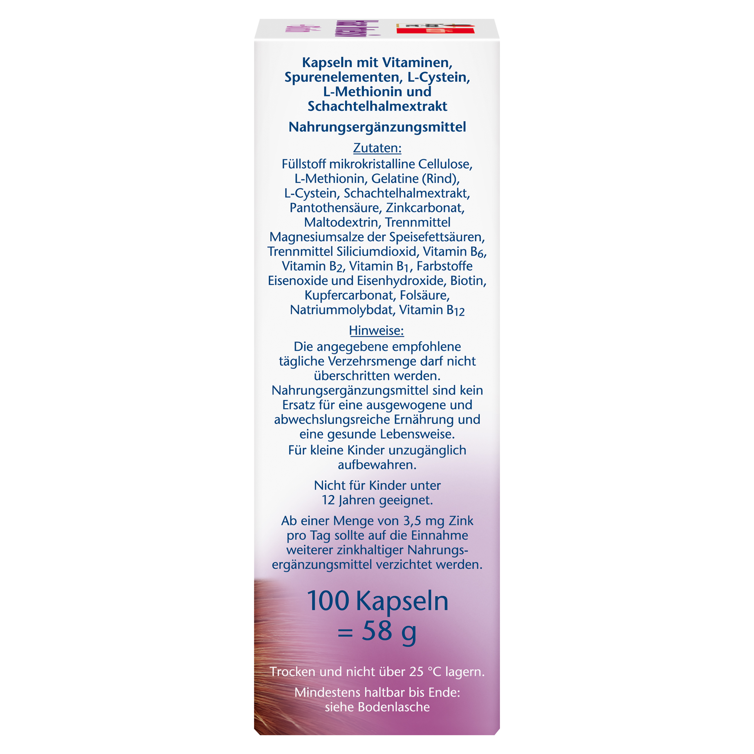 Füllstoff mikrokristalline Cellulose, L-Methionin, Gelatine (Rind), L-Cystein, Schachtelhalmextrakt, Calcium-D-Pantothenat, Zinkcarbonat, Maltodextrin, Trennmittel Magnesiumsalze der Speisefettsäuren, Trennmittel Siliciumdioxid, Pyridoxinhydrochlorid, Riboflavin, Thiaminhydrochlorid, Farbstoff Eisenoxide und Eisenhydroxide, D-Biotin, Kupfercarbonat, Pteroylmonoglutaminsäure, Natriummolybdat, Cyanocobalamin