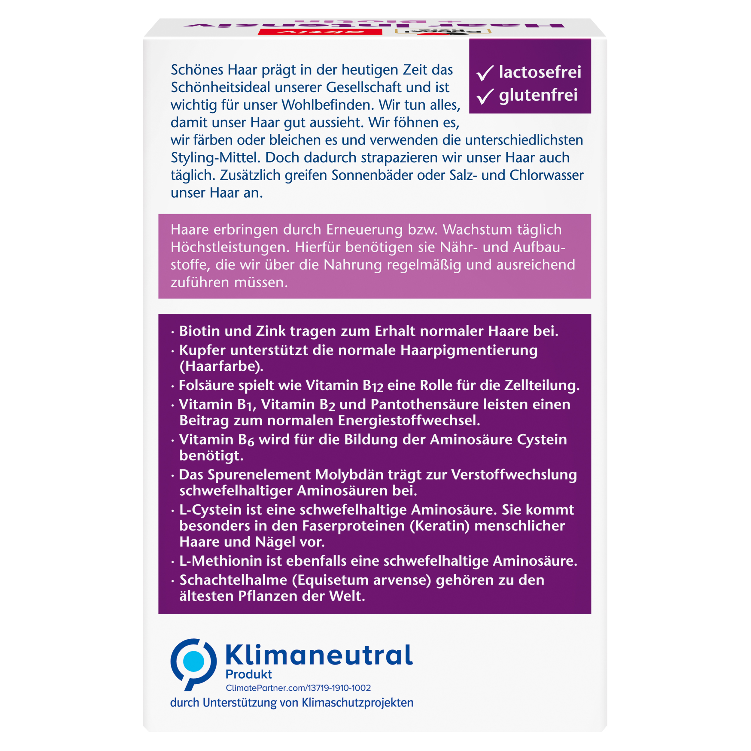 Schönes Haar prägt in der heutigen Zeit das Schönheitsideal unserer Gesellschaft und ist wichtig für unser Wohlbefinden. Wir tun alles, damit unser Haar gut aussieht. Wir föhnen es, wir färben oder bleichen es und verwenden die unterschiedlichsten Styling-Mittel. Doch dadurch strapazieren wir unser Haar auch täglich. Zusätzlich greifen Sonnenbäder oder Salz- und Chlorwasser unser Haar an. Haare erbringen durch Erneuerung bzw. Wachstum täglich Höchstleistungen. Hierfür benötigen sie Nähr- und Aufbaustoffe, die wir über die Nahrung regelmäßig und ausreichend zuführen müssen. Biotin und Zink tragen zum Erhalt normaler Haare bei. Kupfer unterstützt die normale Haarpigmentierung (Haarfarbe). Folsäure spielt wie Vitamin B12 eine Rolle für die Zellteilung. Vitamin B1, Vitamin B2 und Pantothensäure leisten einen Beitrag zum normalen Energiestoffwechsel. Vitamin B6 wird für die Bildung der Aminosäure Cystein benötigt. Das Spurenelement Molybdän trägt zur Verstoffwechslung schwefelhaltiger Aminosäuren bei. L-Cystein ist eine schwefelhaltige Aminosäure. Sie kommt besonders in den Faserproteinen (Keratin) menschlicher Haare und Nägel vor. L-Methionin ist ebenfalls eine schwefelhaltige Aminosäure. Schachtelhalme (Equisetum arvense) gehören zu den ältesten Pflanzen der Welt.