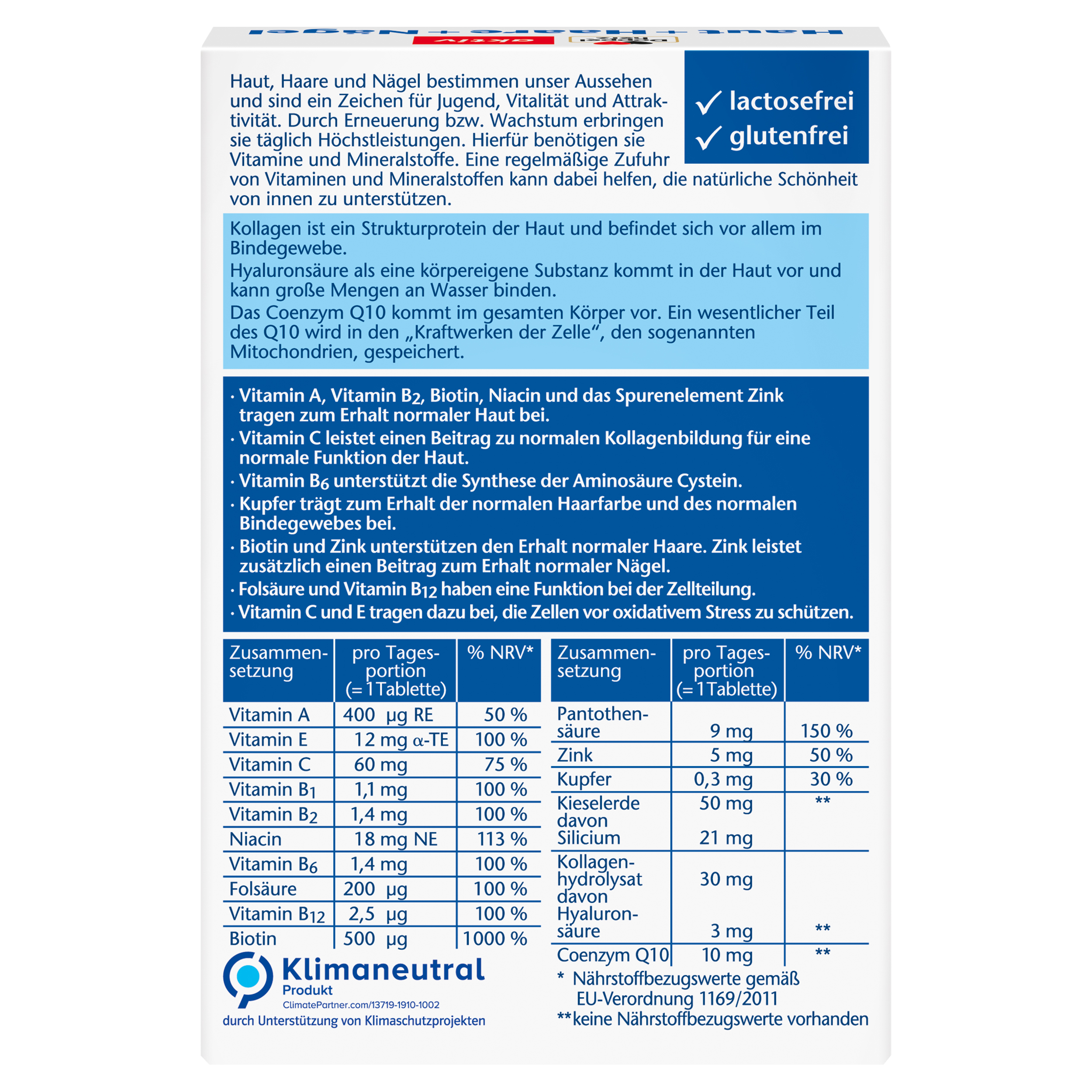 • Vitamin A, Vitamin B2, Biotin, Niacin und das Spurenelement Zink tragen zum Erhalt normaler Haut bei