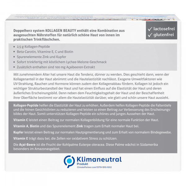 Doppelherz system KOLLAGEN BEAUTY enthält Kollagen-Peptide sowie ausgesuchte Vitamine und Spurenelemente plus Açaibeeren-Extrakt. Als hochwertiges Nahrungsergänzungsmittel ist Doppelherz system KOLLAGEN BEAUTY für die langfristige Einnahme konzipiert. Ein möglicher Effekt stellt sich nach vier bis acht Wochen ein. Die aufeinander abgestimmten Nährstoffe sind im praktischen Trinkfläschchen enthalten: sofort trinkfertig mit köstlichem Lycee-Melone-Geschmack.
