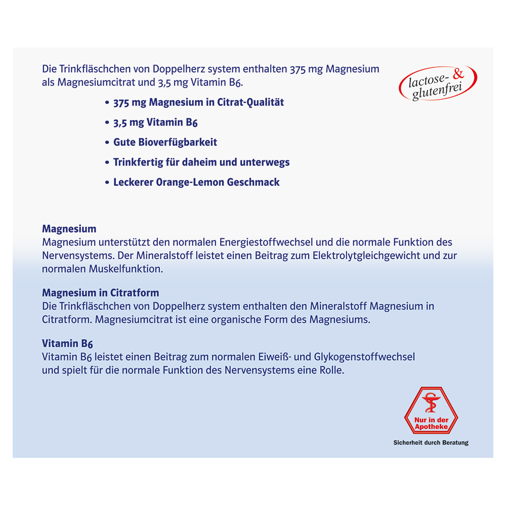 • 375 mg Magnesium in Citrat-Qualität sowie 3,5 mg Vitamin B6 pro Trinkfläschchen