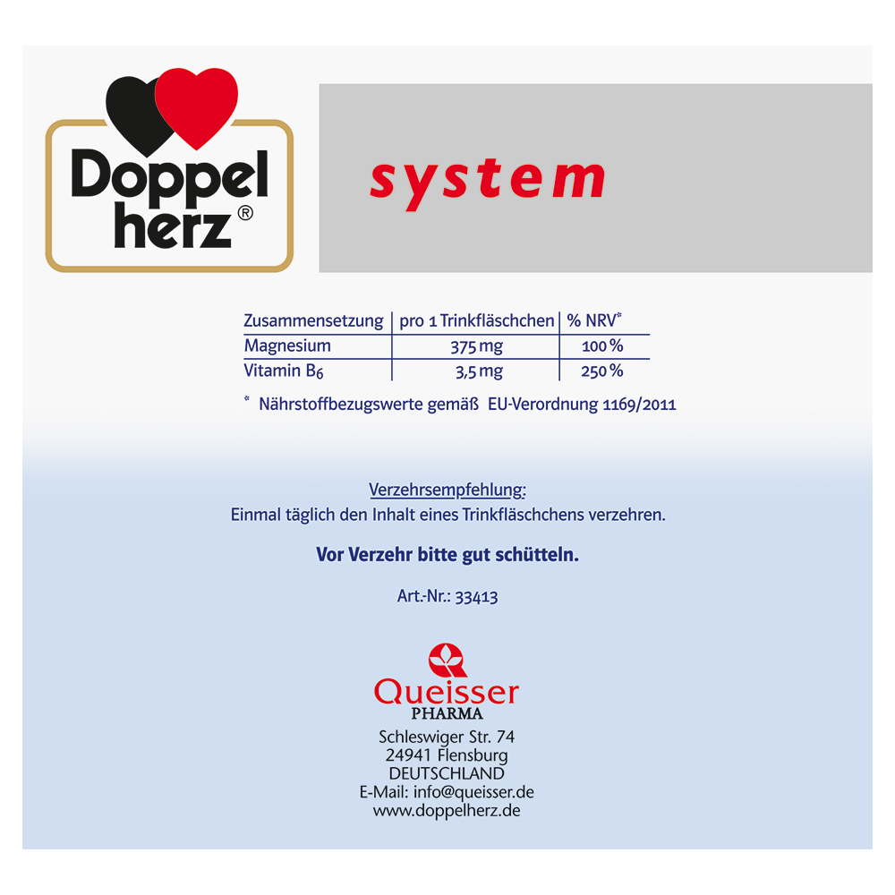 DoppelherzNahrungsergänzungsmittel sind kein Ersatz für eine ausgewogene und abwechslungsreiche Ernährung und eine gesunde Lebensweise. Die angegebene empfohlene tägliche Verzehrsmenge darf nicht überschritten werden. Außerhalb der Reichweite von kleinen Kindern aufbewahren.