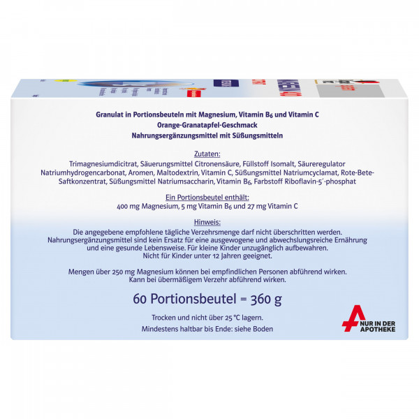 Einmal täglich 1 Portionsbeutel in 1 Glas Wasser (ca. 200 ml) auflösen und trinken. Die Einnahme empfiehlt sich bei einem erhöhten Magnesiumbedarf aufgrund körperlicher Belastung (z.B. Sport), wenn gleichzeitig eine unausgewogene Ernährung vorliegt. Liegt lediglich eine magnesiumarme Ernährung vor, empfiehlt es sich täglich den Inhalt eines ½ Portionsbeutels in ca. 100 ml Wasser aufzulösen und zu trinken.