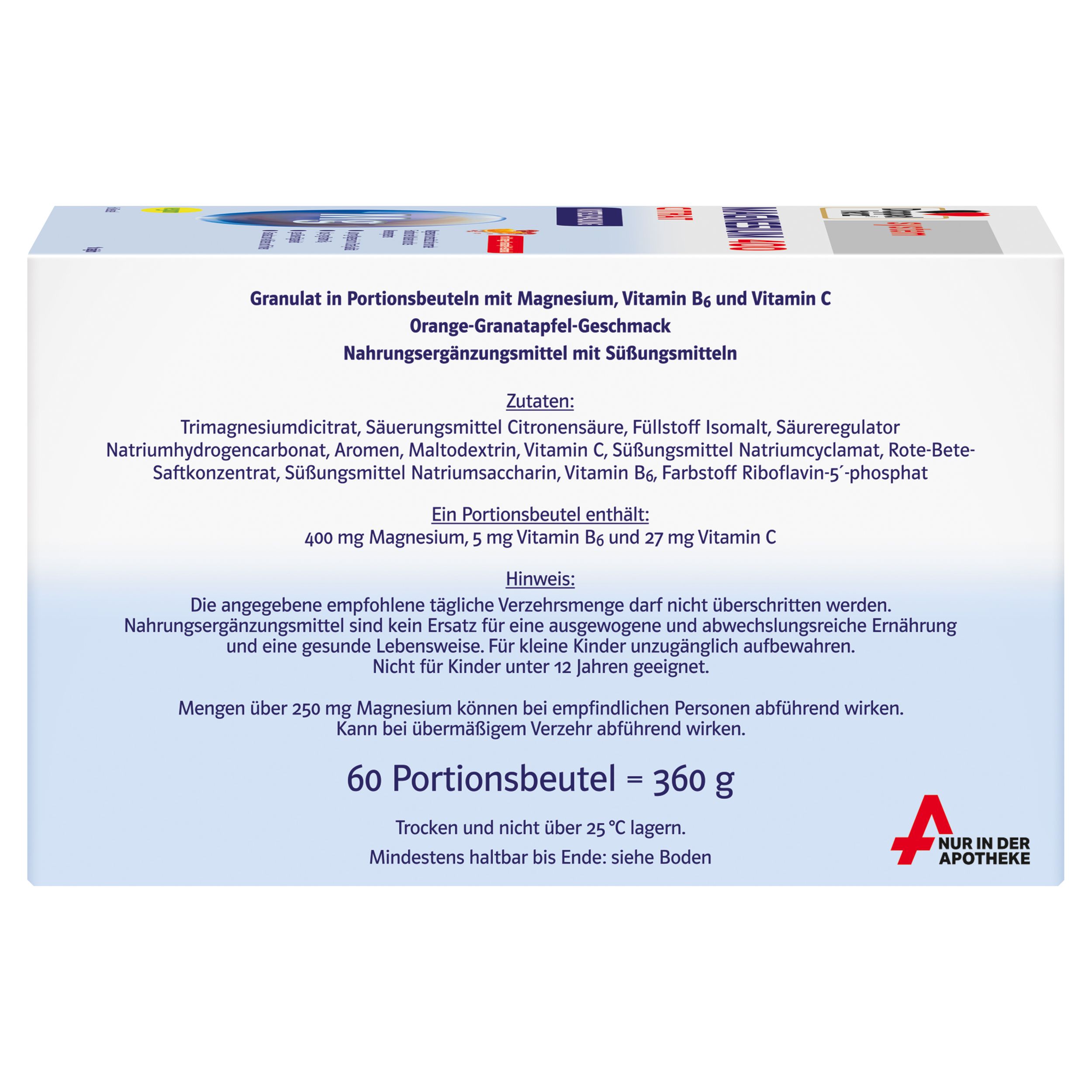 Magnesiumcitrat, Säuerungsmittel Citronensäure, Füllstoff Isomalt, Säureregulator Natriumhydrogencarbonat, Aroma, Maltodextrin, Süßungsmittel Natriumcyclamat und Natriumsaccharin, Rote-Bete-Saftpulver, L-Ascorbinsäure, Pyridoxinhydrochlorid, Farbstoff Riboflavin-5´-phosphat