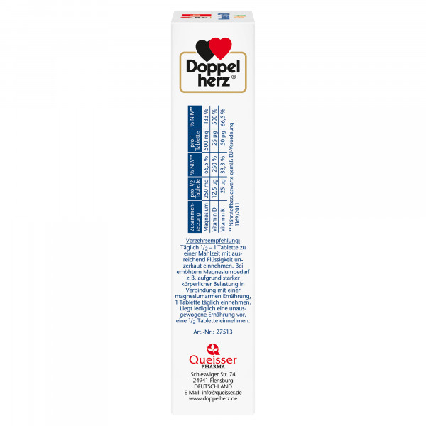 DoppelherzNahrungsergänzungsmittel sind kein Ersatz für eine ausgewogene und abwechslungsreiche Ernährung und eine gesunde Lebensweise. Die angegebene empfohlene tägliche Verzehrsmenge darf nicht überschritten werden. Außerhalb der Reichweite von kleinen Kindern aufbewahren.