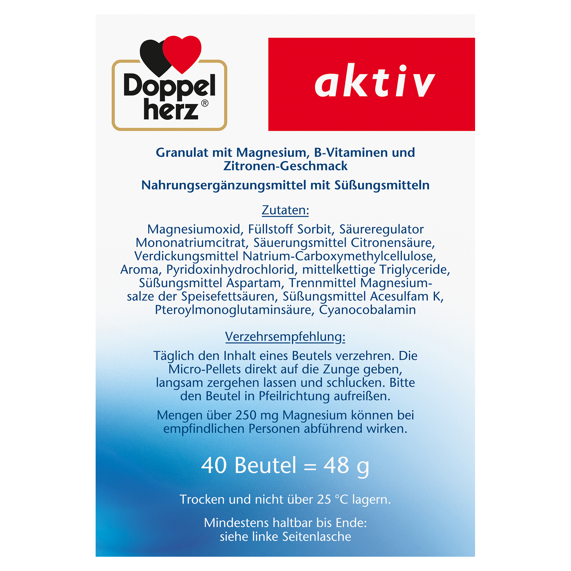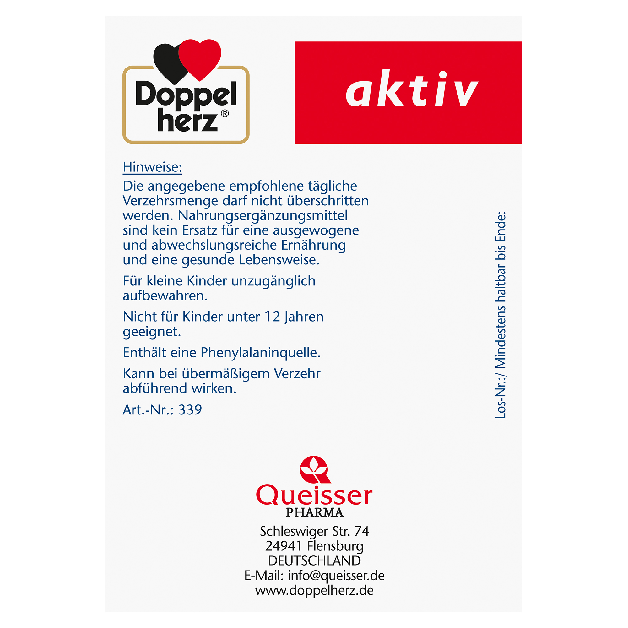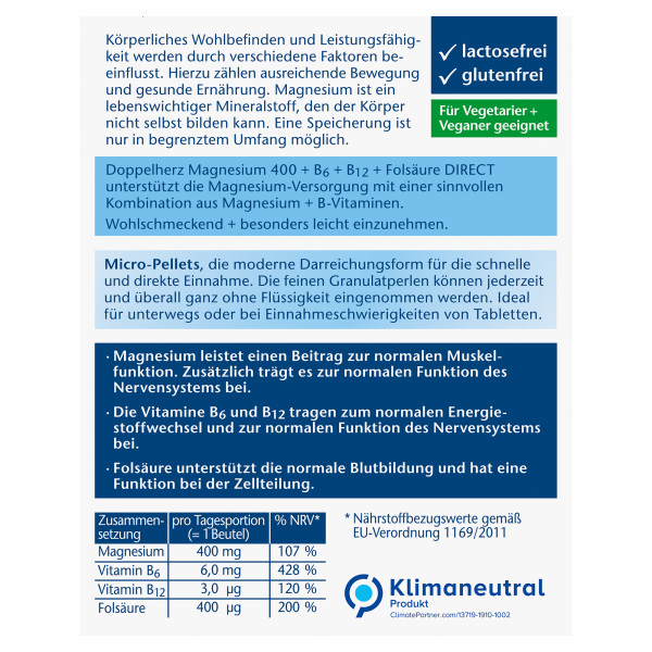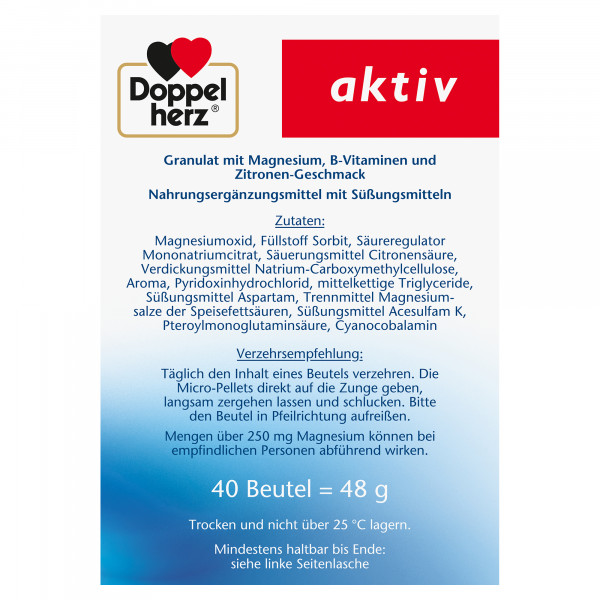 DoppelherzNahrungsergänzungsmittel sind kein Ersatz für eine ausgewogene und abwechslungsreiche Ernährung und eine gesunde Lebensweise. Die angegebene empfohlene tägliche Verzehrsmenge darf nicht überschritten werden. Außerhalb der Reichweite von kleinen Kindern aufbewahren.