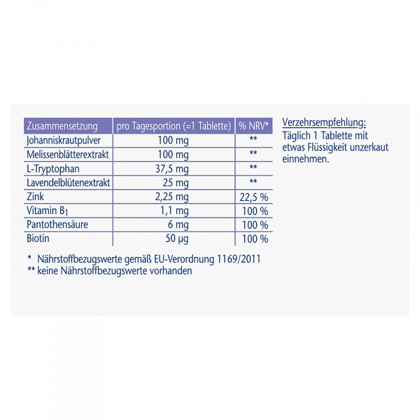 • Plus Johanniskrautpulver, Melissenblätterextrakt, L-Tryptophan und Lavendelblütenextrakt