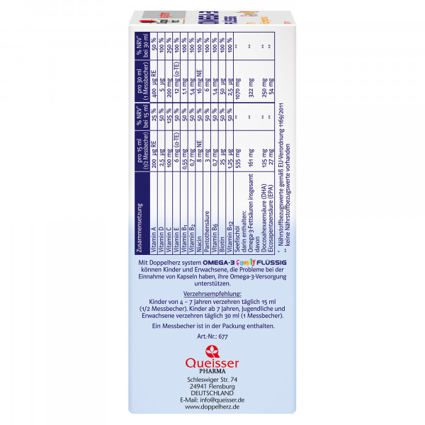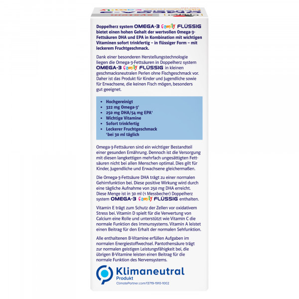Doppelherz system Produkte bieten eine sinnvolle, systematisch abgestimmte Kombination verschiedener Nährstoffe – Gesundheit mit System. Dank einer besonderen Herstellungstechnologie liegen die Omega-3-Fettsäuren in Doppelherz system OMEGA-3 FLÜSSIG in kleinen geschmacksneutralen Perlen ohne Fischgeschmack vor. Das Produkt ist daher für Kinder und Jugendliche sowie für Erwachsene, die keinen Fisch mögen, besonders gut geeignet. Doppelherz system OMEGA-3 FLÜSSIG bietet einen hohen Gehalt der wertvollen Omega3-Fettsäuren DHA und EPA in Kombination mit wichtigen Vitaminen sofort trinkfertig – in flüssiger Form – mit leckerem Fruchtgeschmack. Omega-3-Fettsäuren sind ein wichtiger Bestandteil einer gesunden Ernährung. Dennoch ist die Versorgung mit diesen langkettigen mehrfach ungesättigten Fettsäuren nicht bei allen Menschen optimal. Dies gilt für Kinder, Jugendliche und Erwachsene gleichermaßen. Die Omega-3-Fettsäure DHA trägt zu einer normalen Gehirnfunktion bei. Diese positive Wirkung wird durch eine tägliche Aufnahme von 250 mg DHA erreicht. Diese Menge ist in 30 ml (1 Messbecher) Doppelherz system OMEGA-3 FLÜSSIG enthalten. Die wichtigen Vertreter der Omega-3-Fettsäuren sind die Eicosapentaensäure (EPA) und die Docosahexaensäure (DHA), die nicht im Körper ohne Vorstufen gebildet werden können. Aber nur wenige Lebensmittel enthalten diese wertvollen Fettsäuren. Gute Quellen sind fette Kaltwasserfische wie z. B. Makrele, Hering oder Sardinen. Dennoch mag nicht jedes Kind oder jeder Erwachsene mehrmals in der Woche Fisch essen. Mit Doppelherz system OMEGA-3 FLÜSSIG können Kinder und Erwachsene ihre Omega3-Versorgung unterstützen.