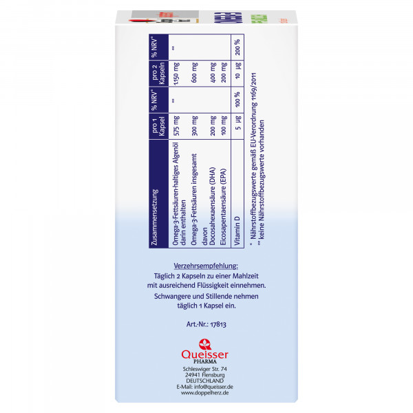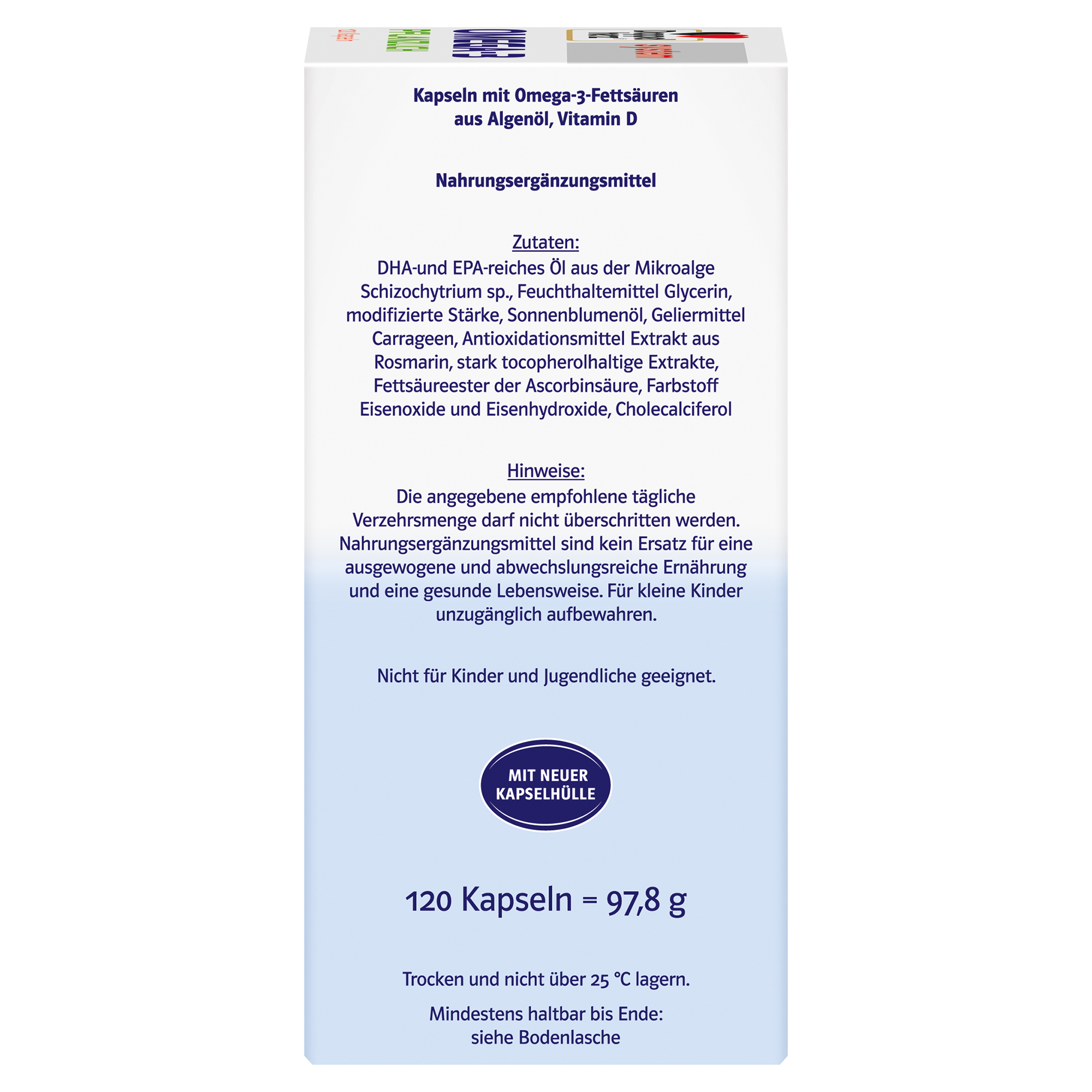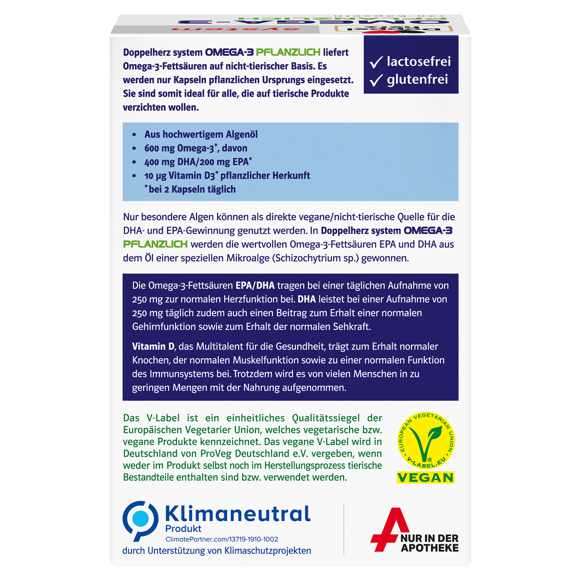 Doppelherz system OMEGA-3 PFLANZLICH liefert Omega-3-Fettsäuren auf nicht-tierischer bzw. veganer Basis und ist damit ideal für alle, die auf tierische Produkte verzichten wollen. Die wertvollen Omega-3-Fettsäuren DHA (Docosahexaensäure) und EPA (Eicosapentaensäure) werden aus dem Öl einer speziellen Mikroalge (Schizochytrium sp.) gewonnen. Das hochwertige Algenöl zeichnet sich durch einen hohen Gehalt der wertvollen Omega-3-Fettsäuren DHA und EPA aus. Die Omega-3-Fettsäuren EPA/DHA tragen bei einer täglichen Aufnahme von 250 mg zur normalen Herzfunktion bei. DHA leistet bei einer Aufnahme von 250 mg täglich zudem auch einen Beitrag zum Erhalt einer normalen Gehirnfunktion sowie zum Erhalt der normalen Sehkraft. 2 Kapseln täglich liefern 600 mg der Omega-3-Fettsäuren EPA und DHA aus Algenöl in Kombination mit 10 µg Vitamin D3 pflanzlicher Herkunft. Vitamin D, das Multitalent für die Gesundheit, trägt zum Erhalt normaler Knochen, der normalen Muskelfunktion sowie zu einer normalen Funktion des Immunsystems bei.