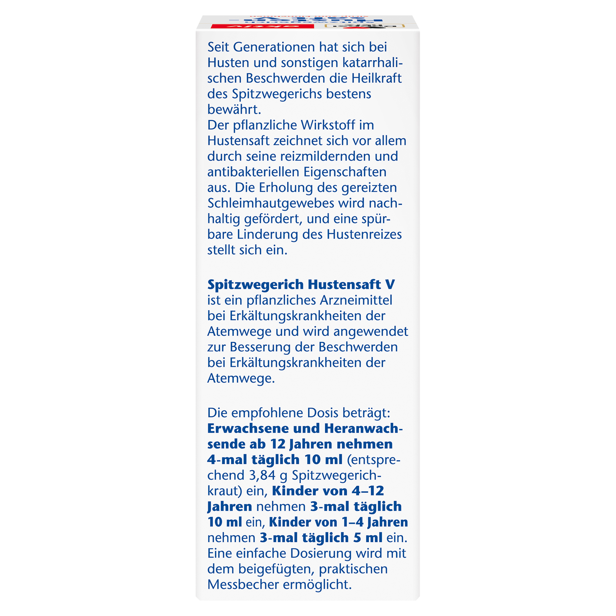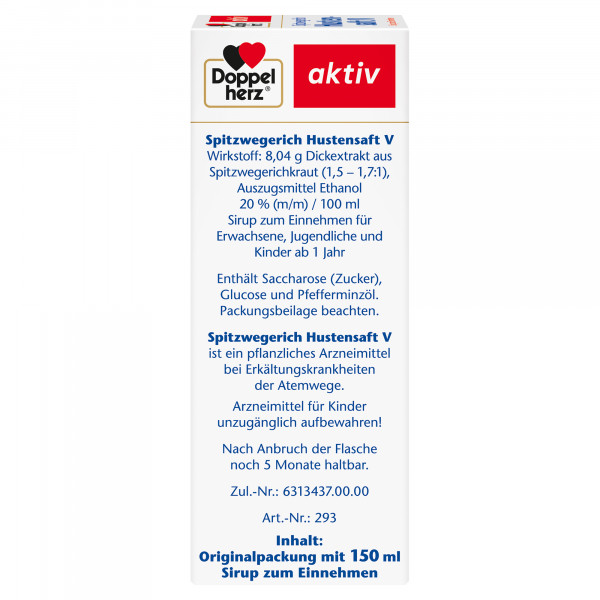 Das Arzneimittel Spitzwegerich Hustensaft V von Doppelherz enthält 8,04 g Dickextrakt aus Spitzwegerichkraut (1,5 - 1, 7: 1), Auszugsmittel Ethanol 20 % (m/m) in 100 ml. Spitzwegerich Hustensaft V ist ein pflanzliches Arzneimittel bei Erkältungskrankheiten der Atemwege und wird angewendet zur Besserung der Beschwerden bei Erkältungskrankheiten der Atemwege. Empfohlene Dosis zur Einnahme für Erwachsene und Heranwachsende ab 12 Jahren: 4-mal täglich 10 ml (entspr. 3, 84 g Spitzwegerichkraut). Empfohlene Dosis zur Einnahme für Kinder von 4-12 Jahren: 3-mal täglich 10 ml und für Kinder von 1-4 Jahren 3-mal täglich 5 ml.