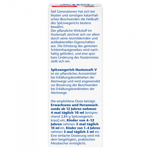 • Empfohlene Dosis zur Einnahme für Erwachsene und heranwachsende ab 12 Jahren: 4-mal täglich 10 ml (entspr. 3, 84 g Spitzwegerichkraut)