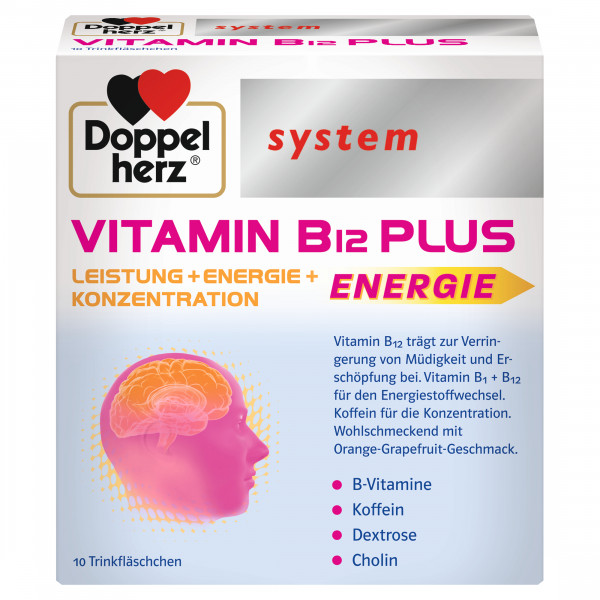Doppelherz system VITAMIN B12 PLUS enthält 10 g Dextrose, 30 µg Vitamin B12, 75 mg Koffein, 100 mg Cholin, Vitamin B1 und Pantothensäure. Die aufeinander abgestimmten Nährstoffe sind im praktischen Trinkfläschchen enthalten – sofort trinkfertig mit leckerem Orange-GrapefruitGeschmack. Vitamin B12 unterstützt den normalen Energiestoffwechsel, trägt zur Verminderung von Erschöpfung und Müdigkeit bei und spielt für die Funktion des Nervensystems eine Rolle. Vitamin B1 trägt zum normalen Energiestoffwechsel bei und unterstützt die normale Funktion des Nervensystems. Pantothensäure leistet einen Beitrag zur normalen geistigen Leistungsfähigkeit, trägt zur Verminderung von Müdigkeit und Erschöpfung bei und spielt eine Rolle für den normalen Energiestoffwechsel. Koffein hilft, Aufmerksamkeit und Wachheit zu steigern und wirkt so geistiger Ermüdung entgegen. Es hilft, die Konzentration zu verbessern. Cholin ist eine fettähnliche Substanz, die für die Gesundheit wichtig ist und zum normalen Fettstoffwechsel beiträgt. Es ist Bestandteil von Phospholipiden, den Hauptbestandteilen der Zellmembranen und kommt daher in allen Körperzellen vor.