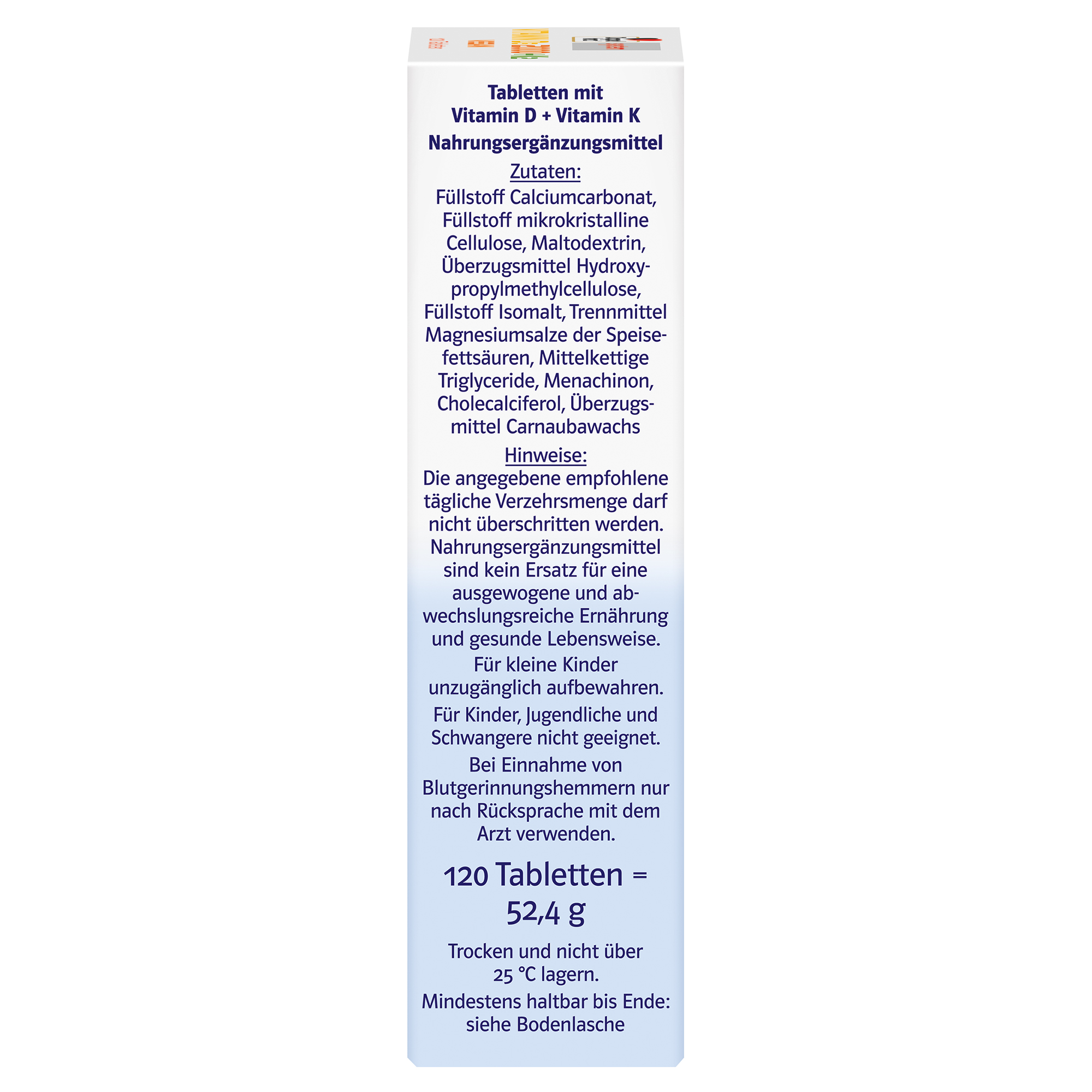 Füllstoff Calciumcarbonat, Füllstoff mikrokristalline Cellulose, Maltodextrin, Überzugsmittel Hydroxypropylmethylcellulose, Füllstoff Isomalt, Trennmittel Magnesiumsalze der Speisefettsäuren, Mittelkettige Triglyceride, Menachinon, Cholecalciferol, Überzugsmittel Carnaubawachs