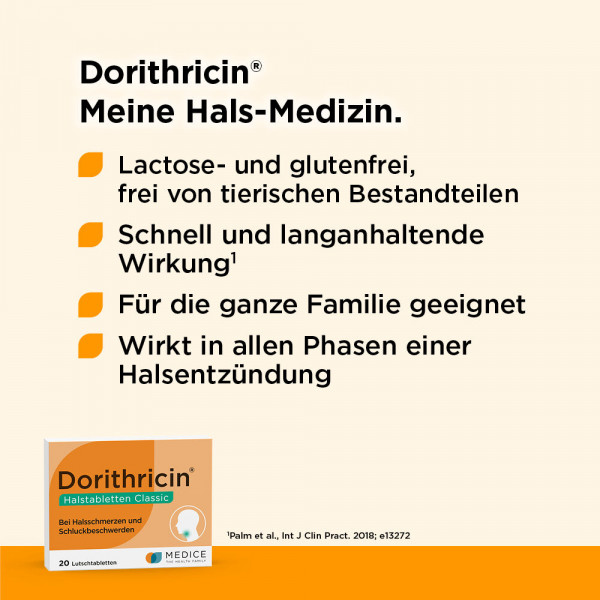Zur Behandlung von Halsschmerzen und Schluckbeschwerden hat sich Dorithricin® seit Jahrzehnten ausgezeichnet bewährt. Es hilft schnell und effektiv zugleich. Mit der einzigartigen Wirkstoff-Formel lindert Dorithricin® nicht nur schnell den Schmerz, sondern bekämpft auch gezielt Bakterien und Viren (Schmidbauer, M., 2015: Dorithricin® wirkt antiviral (in vitro). Pharm. Ztg., 160. Jahrgang, 38. Ausg.: Seite 48–52) und bremst den Infekt, bevor die Halsschmerzen schlimmer werden.