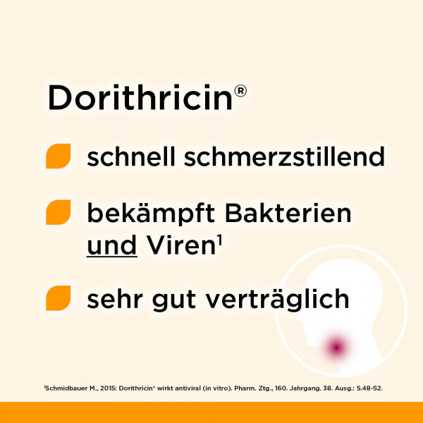 Zur Behandlung von Halsschmerzen und Schluckbeschwerden hat sich Dorithricin® seit Jahrzehnten ausgezeichnet bewährt. Es hilft schnell und effektiv zugleich. Mit der einzigartigen Wirkstoff-Formel lindert Dorithricin® nicht nur schnell den Schmerz, sondern bekämpft auch gezielt Bakterien und Viren (Schmidbauer, M., 2015: Dorithricin® wirkt antiviral (in vitro). Pharm. Ztg., 160. Jahrgang, 38. Ausg.: Seite 48–52) und bremst den Infekt, bevor die Halsschmerzen schlimmer werden.