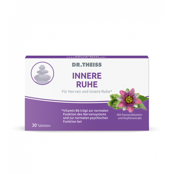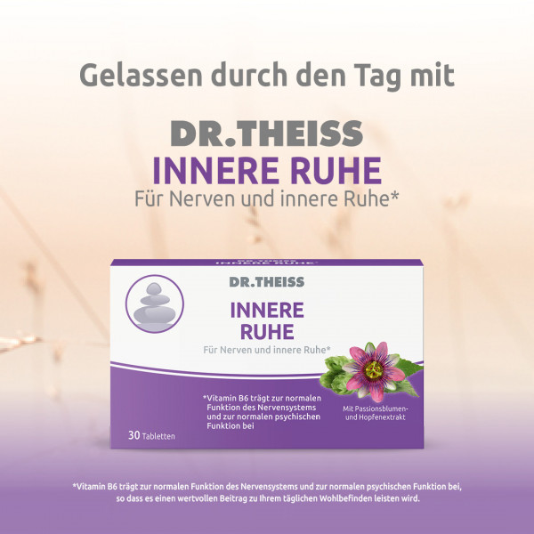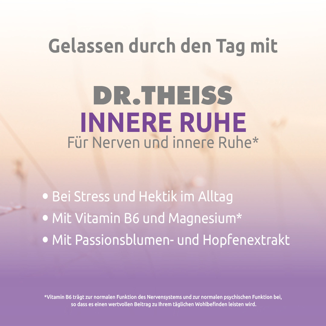 Nahrungsergänzungsmittel mit Vitamin B6, Magnesium plus Passionsblumen- und Hopfenextrakt. Verspüren Sie eine innere Unruhe? Können Sie nicht zur Ruhe kommen? Stress und Hektik im Alltag führt oft zu Überlastung im Berufs- und Privatleben. Dr. Theiss Innere Ruhe* enthält Pflanzenextrakte (Passionsblume und Hopfen), Magnesium und Vitamin B6. Vitamin B6 trägt zur normalen Funktion des Nervensystems und zur normalen psychischen Funktion bei, so dass es einen wertvollen Beitrag zu Ihrem täglichen Wohlbefinden leisten wird.