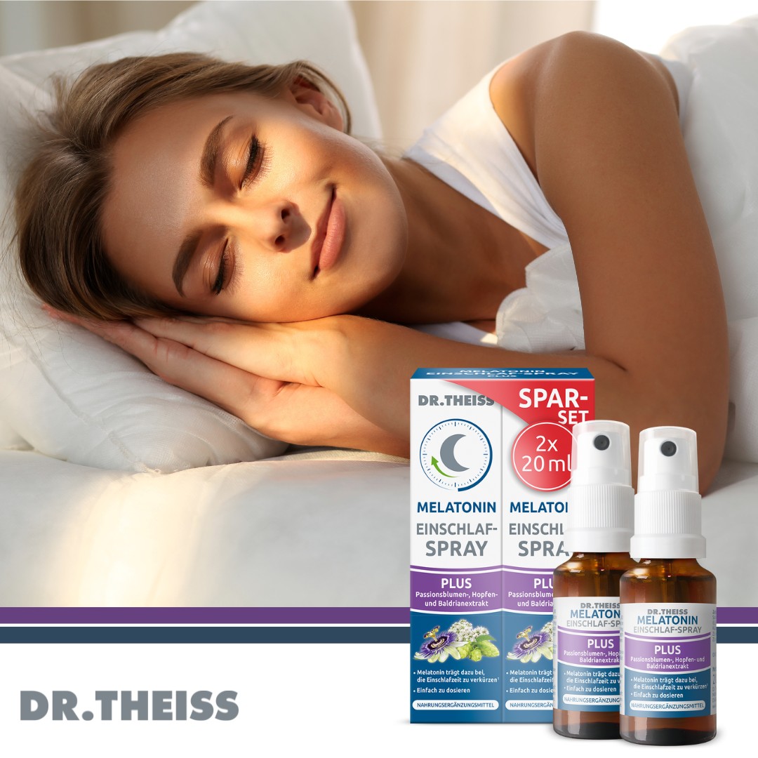 Vertrauen Sie bei Schlafproblemen auf Dr. Theiss – Die meistverkauften Melatonin-Sprays in der deutschen Apotheke*. Dr. Theiss Melatonin Einschlaf-Spray PLUS kombiniert Melatonin, Passionsblumen-, Hopfen- und Baldrianextrakt.<br /r>