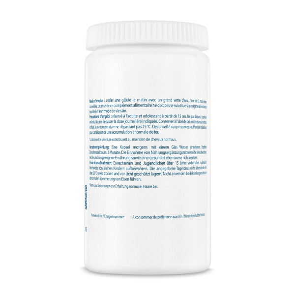 L-CYSTIN; DL-METHIONIN; HYDROXYPROPYLMETHYLCELLULOSE (KAPSELHÜLLE); FÜLLSTOFF: MIKROKRISTALLINE CELLULOSE; SCHACHTELHALM-EXTRAKT (EQUISETUM ARVENSE L.); HEIDELBEER-EXTRAKT (VACCINIUM MYRTILLUS L.); EISENSULFAT; NIACIN; TRENNMITTEL: MAGNESIUMSALZE DER SPEISEFETTSÄUREN; VITAMIN B6; NATRIUMSELENIT; BIOTIN.