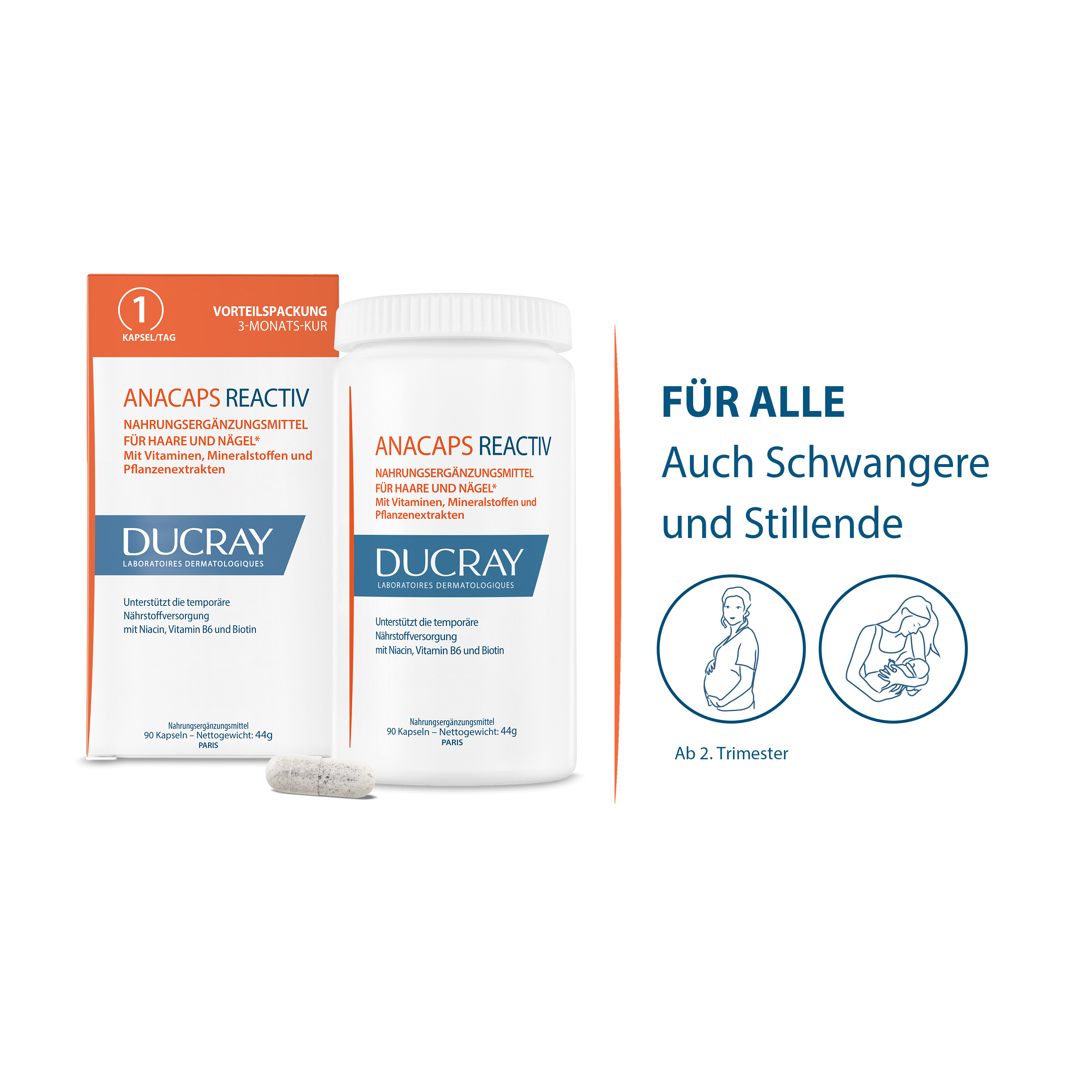 Mit gezielt ausgewählten Pflanzenextrakten sowie Mikronährstoffen unterstützt ANACAPS REACTIV die temporäre Nährstoffversorgung für Haare und Nägel. Biotin und Zink tragen dabei zur Erhaltung normaler Haare bei. Vitamin B6 trägt zu einer normalen Cystein-Synthese bei und zur Regulierung der Hormontätigkeit.
