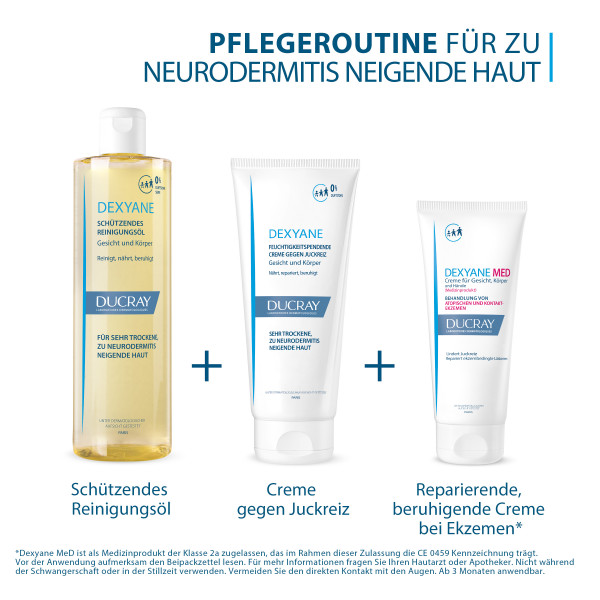 Sehr trockene, zu Neurodermitis neigende Haut fühlt sich oft sehr unangenehm an. Grund dafür ist eine geschädigte Hautbarriere, was zu vermehrtem Spannungsgefühl und teilweise starkem Juckreiz führen kann. Das seidig schützende Reinigungsöl von DEXYANE reinigt die Haut sanft, nährt, reduziert bakterielle Ausbreitung und schützt die Haut vor Hauttrockenheit.