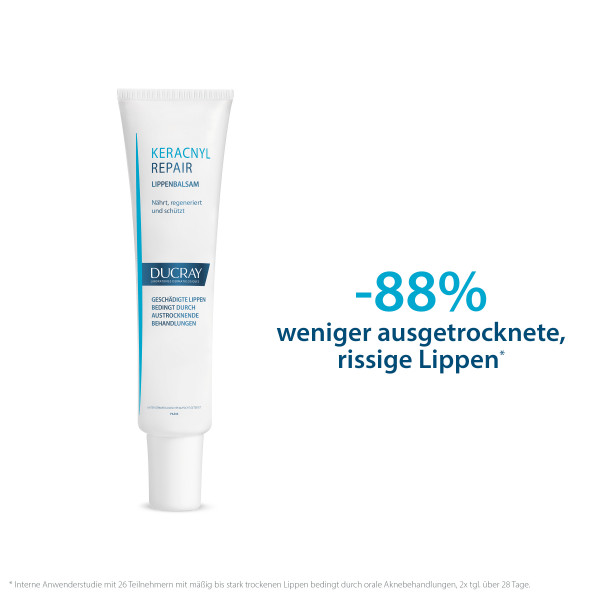 Der KERACNYL PP Lippenbalsam  wurde speziell für die empfindliche, trockene und rissige Lippenhaut entwickelt, die durch austrocknende Akne-Behandlungen beansprucht wurden.