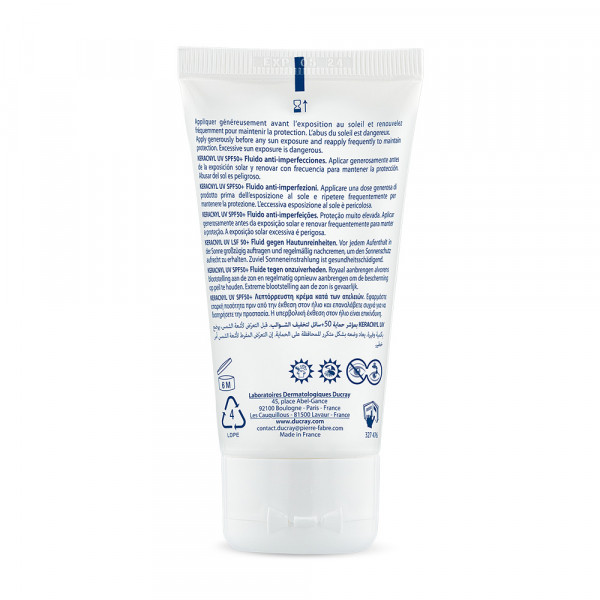 Keracnyl UV SPF 50+ Fluid gegen Hautunreinheiten bietet einen sehr hohen UVA-/UVB -Sonnenschutz für fettige oder zu Akne neigende Haut, und hilft Hautunreinheiten zu entfernen. Das Produkt ist für Jugendliche ab 12 Jahren und Erwachsene geeignet.