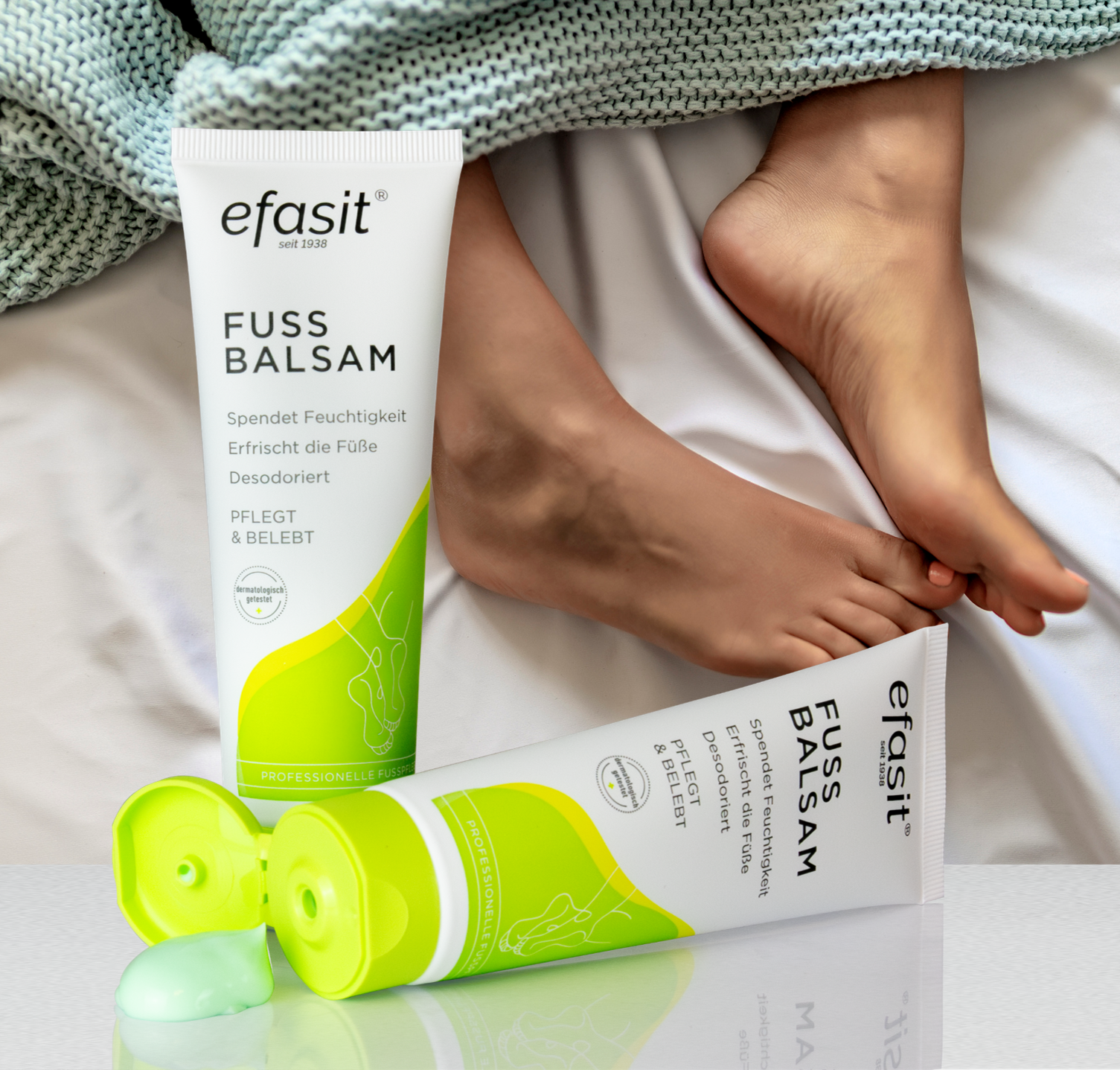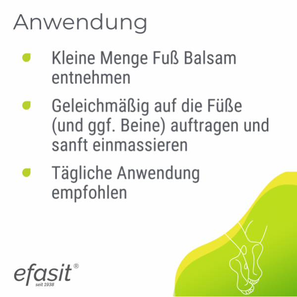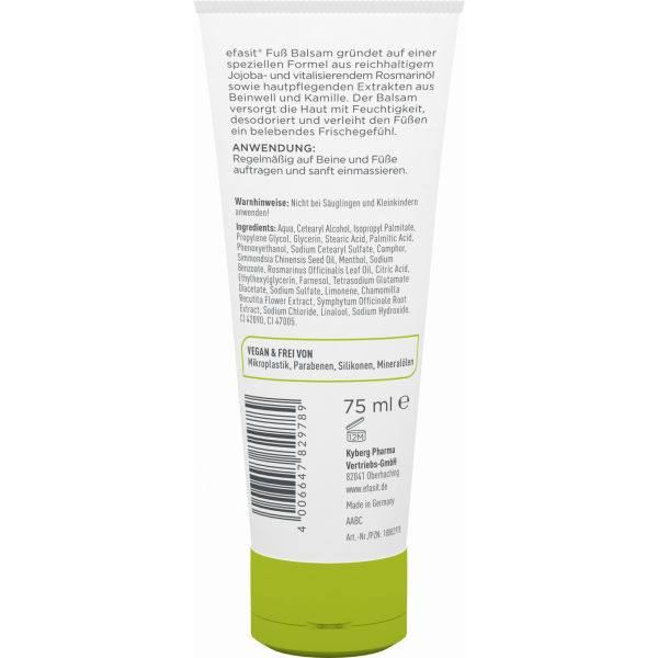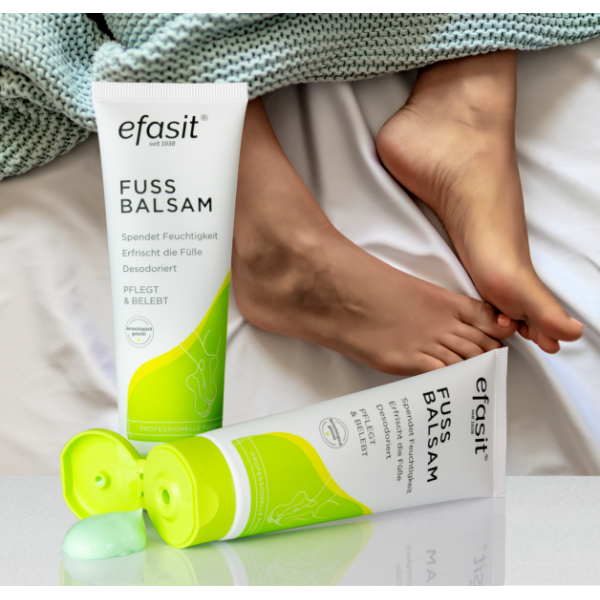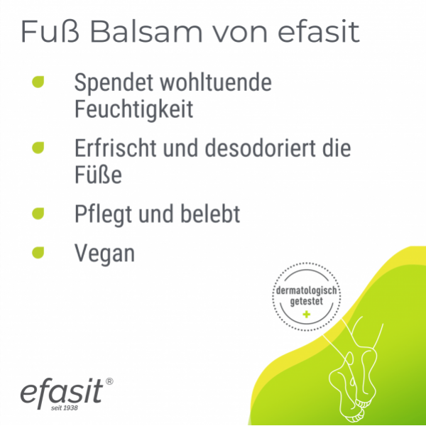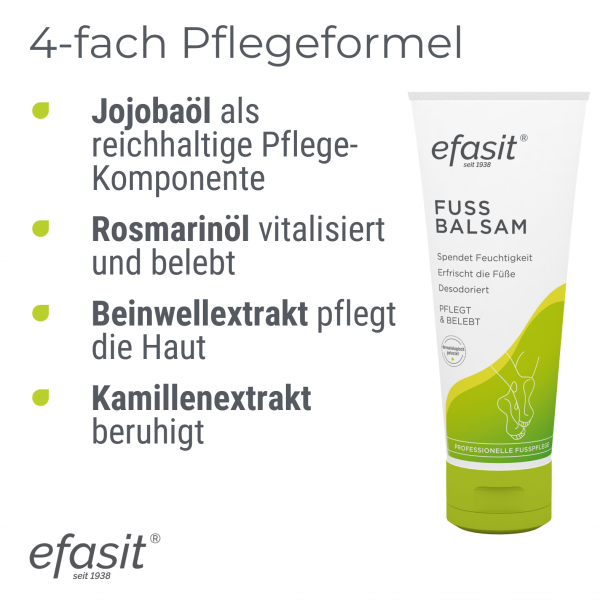 efasit® Fuß Balsam gründet auf einer speziellen Formel aus reichhaltigem Jojoba- und vitalisierendem Rosmarinöl sowie hautpflegenden und hautberuhigenden Extrakten aus Beinwell und Kamille. Der Balsam versorgt die Haut mit Feuchtigkeit, desodoriert und verleiht den Füßen ein belebendes Frischegefühl. Der Balsam wird zur täglichen Pflege, bei trockener Haut und vor oder nach einem langen Tag angewandt.