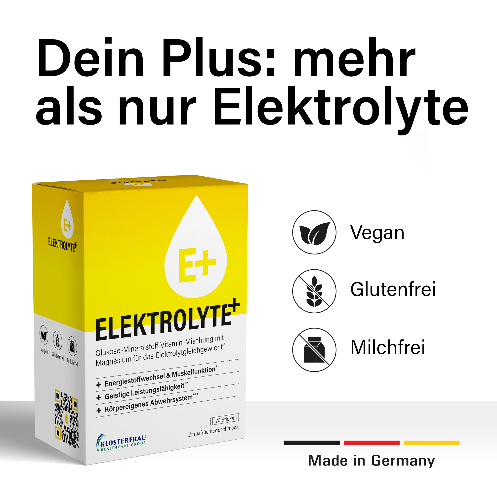 Es basiert auf einer Mischung aus Elektrolyten und Glukose, die zusätzlich mit Vitamin B5 angereichert wurde. Dadurch ist Elektrolyte+ ein wertvoller Begleiter nach intensiver körperlicher Betätigung 1.