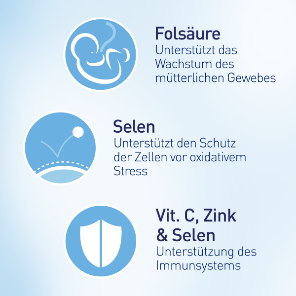 - 400 μg Folat als Folsäure und Metafolin zur Unterstützung des Wachstums des mütterlichen Gewebes während der Schwangerschaft, für eine normale Funktion des Immunsystems und für eine erfolgreiche Zellteilung