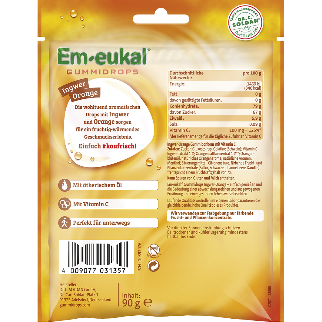 Laktosefrei und glutenfrei. Em-eukal Gummidrops Ingwer-Orange einfach genießen und die Bedeutung einer abwechslungsreichen und ausgewogenen Ernährung und einer gesunden Lebensweise beachten.