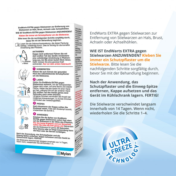 - Jede Packung enthält eine EndWarts Extra gegen Stielwarzen Kartusche (14,3 g N2O verflüssigt), 9 EinwegSpitzen und Schutzpflaster und eine Gebrauchsanweisung.