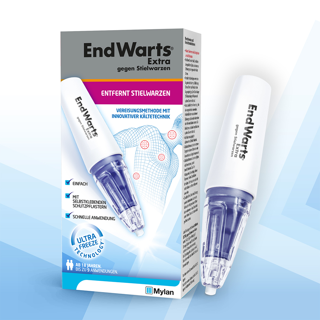 EndWarts Extra gegen Stielwarzen ist ein effektives Mittel zur Selbstbehandlung von Stielwarzen an Hals, Brust, Achsel und Achselhöhle. Es ist das erste Mittel zur Selbstbehandlung von Stielwarzen mit Distickstoffmonoxid, einem Gas, das nach der Aktivierung des Geräts sehr kalt ist. Durch seine Ultra Freeze Technology wird eine Temperatur von etwa -80°C erreicht und die Stielwarze wirksam vereist. EndWarts Extra gegen Stielwarzen ist ein innovatives Produkt, das schnell und einfach anzuwenden ist. Mit seiner Präzisionsspitze und dem schützenden Schaumstoffpflaster ist die Vereisung mit EndWarts Extra gegen Stielwarzen einfach. Die umliegende Haut bleibt unbeeinträchtigt. Die Behandlung ist für Erwachsene über 18 Jahre geeignet.