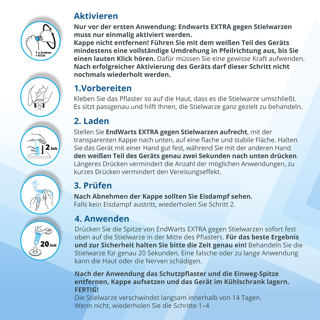 Drücken Sie die Spitze sofort fest oben auf die Stielwarze in der Mitte des Pflasters. Für das beste Ergebnis und zur Sicherheit halten Sie bitte die Zeit genau ein! Behandeln Sie die Stielwarze für genau 20 Sekunden. Entfernen Sie das Schutzpflaster. Wenden Sie es nicht länger als 20 Sekunden an. Verwenden Sie immer ein Schutzpflaster. Eine falsche oder zu lange Anwendung kann die Haut oder die Nerven schädigen. Nach dem Gebrauch EinwegSpitze wechseln, Kappe wieder aufsetzen und im Kühlschrank lagern. Fertig! EndWarts Extra gegen Stielwarzen ist nun für die nächste Anwendung bereit. Innerhalb von 14 Tagen wird die Stielwarze langsam verschwinden. Falls die Stielwarze oder Teile von ihr noch nicht verschwunden sind, wiederholen Sie die Schritte 1 bis 4.