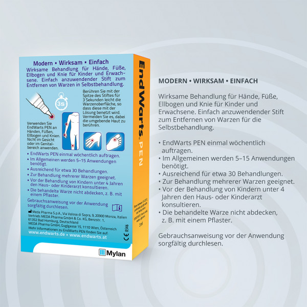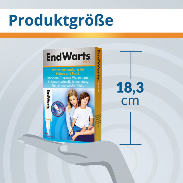 EndWarts Pen ist eine wirksame Lösung zur Entfernung von Warzen, die sowohl bei Kindern als auch bei Erwachsenen zur Behandlung von Warzen an Händen, Füßen, Ellbogen und Knien angewendet werden kann. EndWarts Pen hilft dem Körper die Warzen auszutrocknen und abzustoßen. Die Lösung dringt direkt in die Warze ein. EndWarts Pen hinterlässt keine Spuren auf der Haut und ist nicht sichtbar. So können beispielsweise direkt nach dem Auftragen Strümpfe angezogen oder ein Bad genommen werden. EndWarts Pen ist ein in Schweden patentiertes Medizinprodukt, das die CE-Kennzeichnung trägt und biologisch abbaubar ist. Die Eigenschaften der Lösung verhindern ein Wachstum von Bakterien. EndWarts Pen verursacht bei korrekter Anwendung weder Narben noch führt es zu Infektionen. Der Inhalt von EndWarts Pen reicht für ca. 30 Behandlungen.