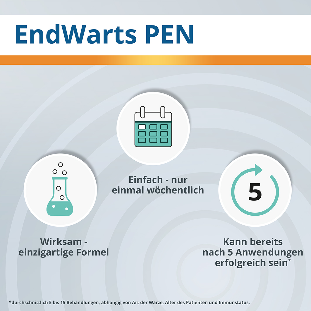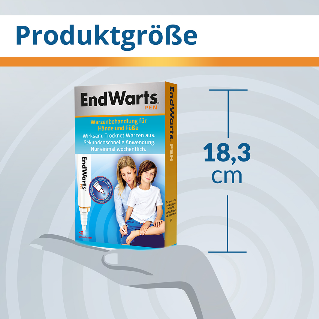 EndWarts Pen ist nachgewiesen wirksam gegen Warzen. Die meisten Warzen verschwinden, ohne wieder aufzutreten. Zuweilen können bereits unter der Haut liegende Warzen zum Vorschein kommen. Warzen sind sehr verschieden in Größe und Erscheinung und daher kann die für die Entfernung erforderliche Zeit unterschiedlich lang sein. Die Behandlungsdauer kann variieren: Meist sind 5 bis 15 Behandlungen erforderlich, Abweichungen nach oben und unten sind möglich. Die erforderliche Behandlungsdauer bis zum Verschwinden der Warzen kann von verschiedenen Faktoren beeinflusst werden, darunter das Alter des Patienten, die Art der Warze, das Immunsystem des Patienten, die Stelle, an der sich die Warze befindet und wie lange die Warze schon existiert. Eine herabgesetzte Immunabwehr und Medikamente wie z.B. Kortison sind Faktoren, welche die Behandlungsdauer verlängern können. Neue Warzen lassen sich meist leichter entfernen als alte. Kinderwarzen lassen sich meist leichter entfernen als Warzen bei Erwachsenen. Bei nach innen wachsenden Warzen und bei Warzen am Nagelbett, die bereits seit vielen Jahren existieren, könnte es länger dauern, bevor Sie feststellen, dass die Behandlung Wirkung zeigt, und es dauert erheblich länger, bevor eine solche Warze vollständig verschwunden ist.