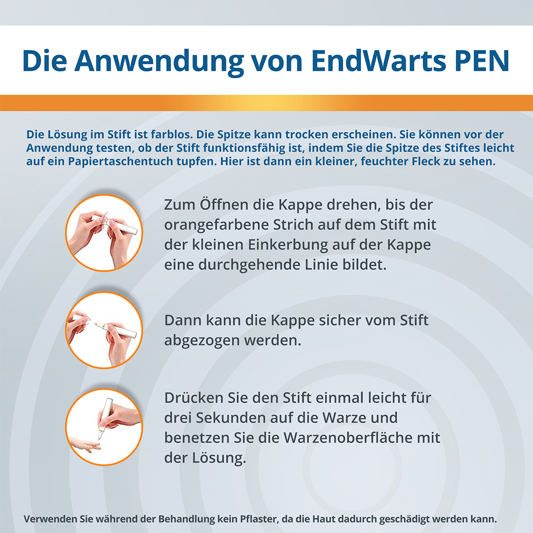 EndWarts Pen wirkt bereits beim Auftragen sehr geringer Mengen. Lesen Sie die folgenden Anweisungen sorgfältig durch, da die Lösung ätzend ist. Um den Kontakt mit der umgebenden Haut zu vermeiden, seien Sie vorsichtig und halten Sie den Stift während des Auftragens der Lösung gut fest. Setzen Sie die Kappe nach Gebrauch wieder korrekt auf. Die Spitze des Stiftes gibt eine kleine Menge der farblosen Lösung ab, wenn diese auf die Warze gedrückt wird. Die Spitze kann trocken erscheinen und es ist schwierig zu sehen, wie viel Lösung auf die Warze aufgetragen wird. Der Stift ist so gestaltet, dass nur die für eine Behandlung der Warze notwendige Menge der Lösung austritt. Sie können vor der Anwendung testen ob der Stift funktionsfähig ist, indem Sie die Spitze des Stiftes leicht auf ein Papiertaschentuch tupfen. Hier ist dann ein kleiner, feuchter Fleck zu sehen. Beim Öffnen des Stiftes ist außerdem ein beißender Geruch wahrnehmbar.