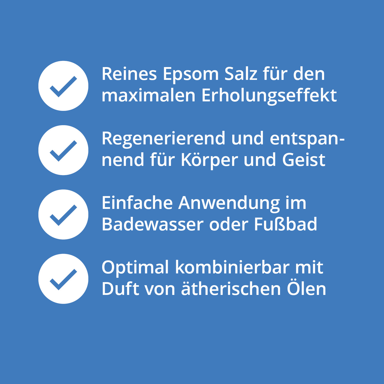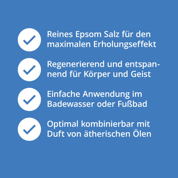 Das Epsom Salz Vitalbad beinhaltet 1000 g reines Epsom Salz in einem praktischen, wiederverschließbaren Standbeutel. Epsom Salz ist ein natürlich vorkommendes, magnesiumreiches Mineral, welches erstmals in den Salzbergwerken in Epsom, England entdeckt wurde. Daher stammt auch der englische Name „Epsom Salt“.