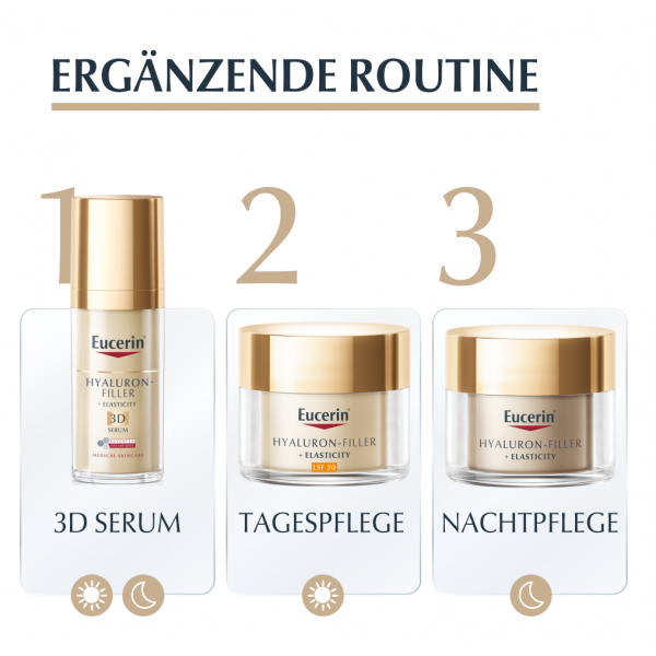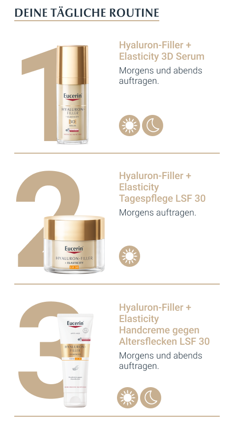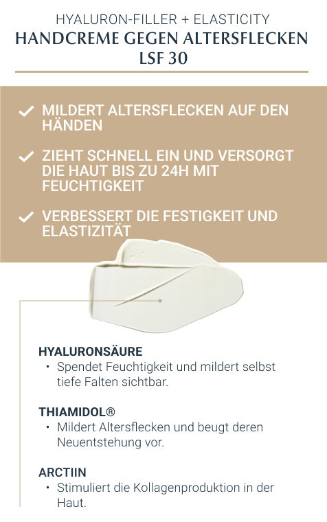 Die Eucerin Hyaluron Filler + Elasticity Handcreme ist eine feuchtigkeitsspendende Handpflege für reife Haut. Dank des patentierten Wirkstoffs Thiamidol kann sie nicht nur Altersflecken mildern, sondern beugt auch der Neuentstehung vor. Altersflecken werden nachweislich bei regelmäßiger Anwendung auf der Hand gemildert. Die Anti Age Hautcreme zieht schnell ein und versorgt die Haut bis zu 24 Stunden mit intensiver Feuchtigkeit – für ein weiches Hautgefühl. Zudem beugt die Handcreme dank LSF 30 der Entstehung neuen, sonnenbedingten Altersflecken vor. Für geschmeidige Hände verbessert die Anti Aging Creme die Elastizität und Festigkeit der Haut. Erste Ergebnisse der Anti Age Creme sowie eine Minderung der Altersflecke sind bereits nach 2 Wochen sichtbar.