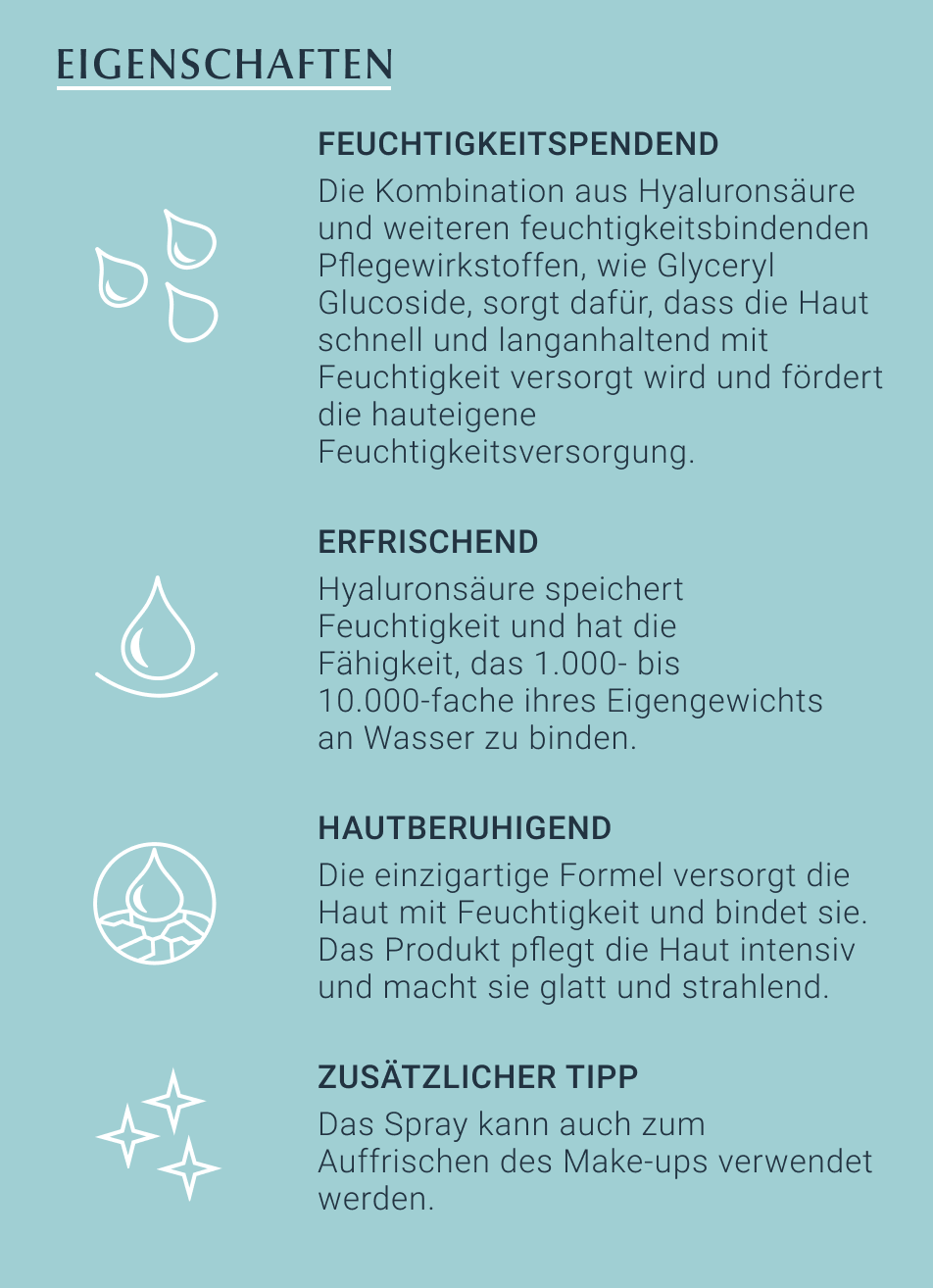 Anders als andere Gesichtssprays, die keine feuchtigkeitsspendenden Inhaltsstoffe enthalten, wirkt das Eucerin Hyaluron Spray mit den Inhaltsstoffen Hyaluronsäure und Glyceryl Glucoside. Hyaluronsäure kann Feuchtigkeit besonders gut speichern, um die Haut zu pflegen. Glyceryl Glucoside aktiviert die Feuchtigkeitsversorgung zwischen den Hautzellen unterstützt den Feuchtigkeitshaushalt der Haut von innen heraus. Die Feuchtigkeit kann so von der Haut gebunden werden und das Spray sorgt für ein glattes und strahlendes Hautgefühl. Das praktische Feuchtigkeitsspray kann jederzeit zur Gesichtspflege verwendet werden, wenn die Haut sich trocken anfühlt. Dabei ist das parfümfreie Spray ebenso für empfindliche Haut geeignet und zieht schnell ein.